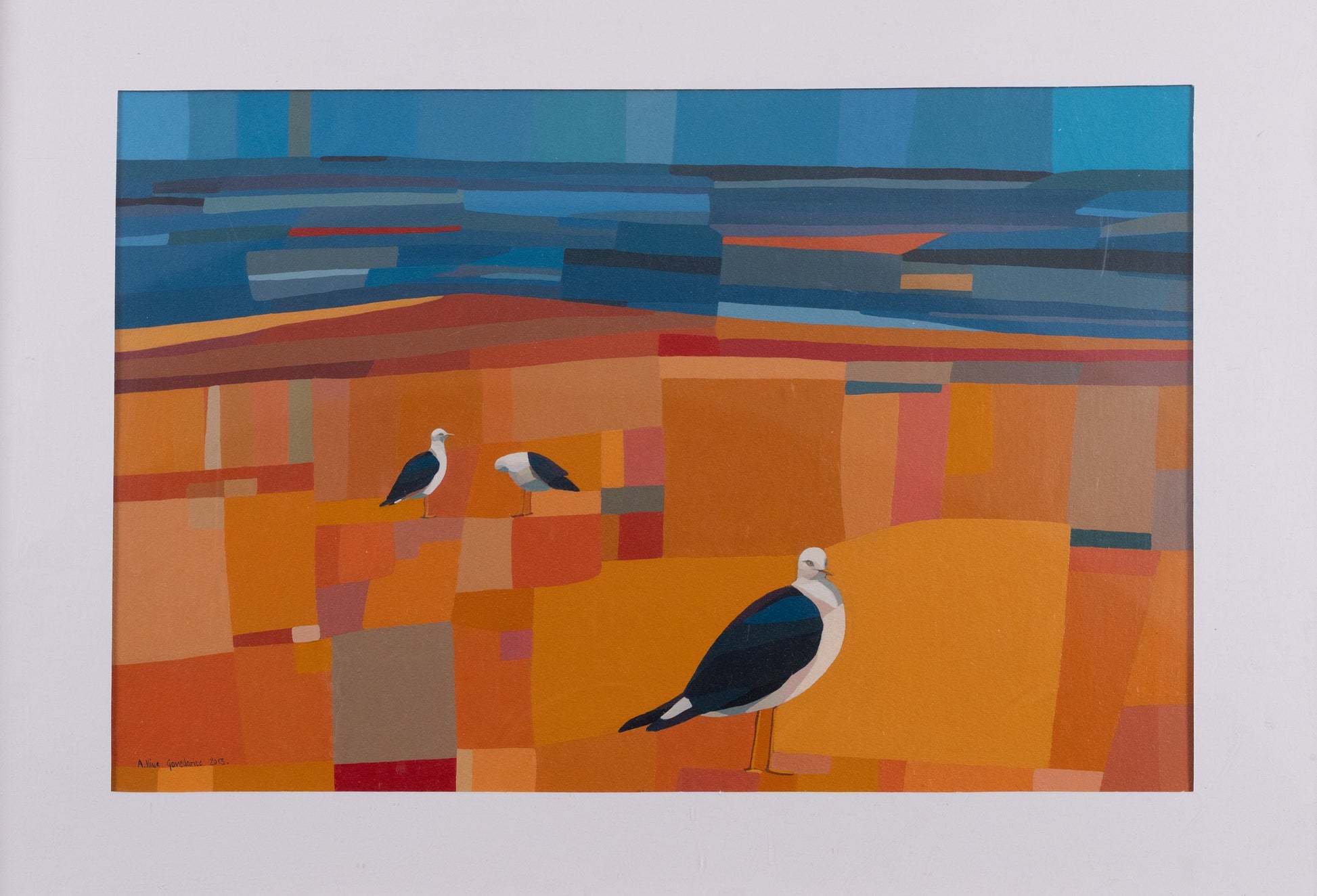 "Seaside Geometry" is a vibrant and contemporary piece that features a stylized landscape dominated by geometric forms. The painting depicts three seagulls standing atop abstract, multi-colored blocks that resemble a cliff overlooking a sea. The layers of blue above the earthy tones suggest a horizon where the sea meets the sky, rendered in bold stripes of various shades. This piece captures the serene yet dynamic nature of coastal regions through an unconventional, geometric abstraction.