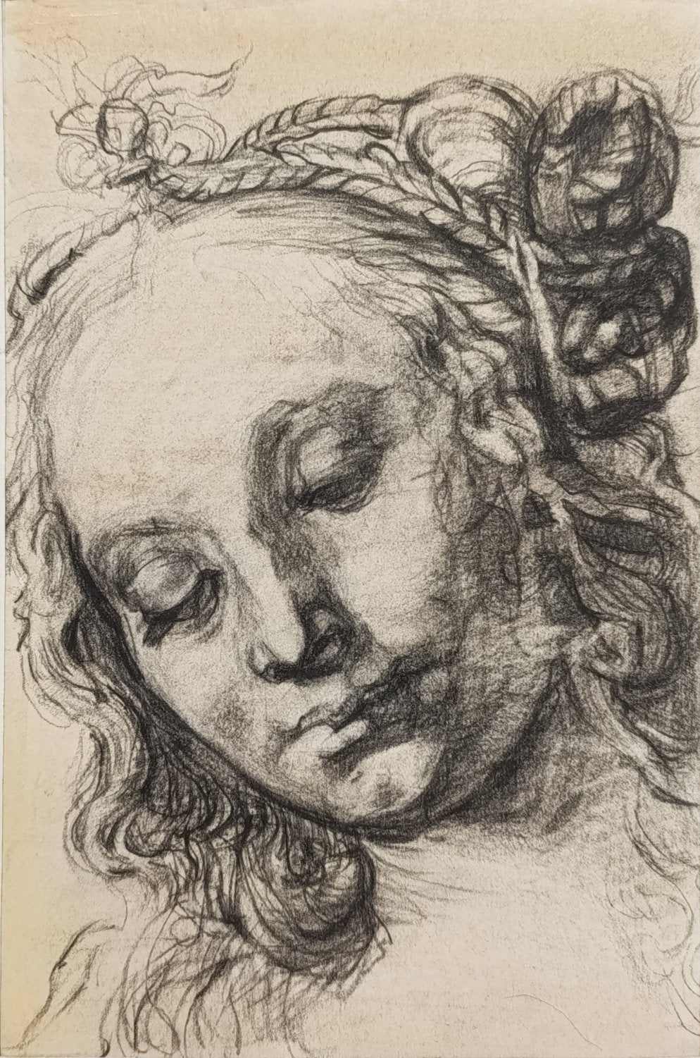 This delicate charcoal sketch on tinted paper is a masterful reproduction of a classical figure, paying homage to the revered works of the Renaissance. Inspired by the timeless beauty of Old Master drawings, this piece captures the peaceful expression of a contemplative woman. The artist has skillfully rendered the soft, flowing hair, evoking a moment of quiet reflection. The careful shading adds depth and texture, while the attention to detail recalls the work of Andrea Del Verroccio.