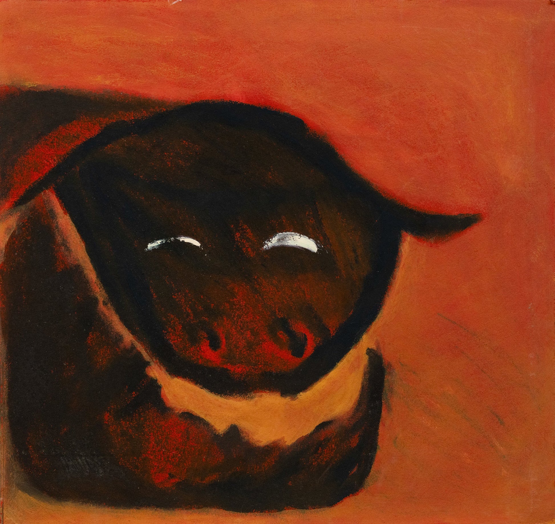 An enigmatic portrait of a beast rendered in deep, dark tones against a fiery backdrop. The minimal details and bold colors create a powerful, almost mystical presence, evoking a sense of primal energy and quiet strength.