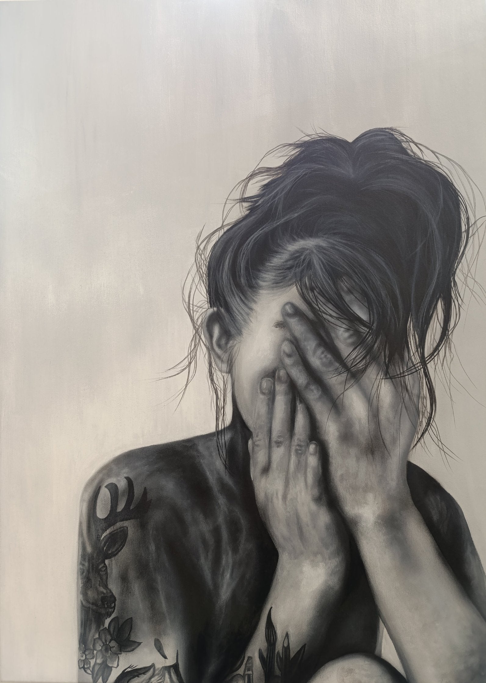 This evocative painting captures a powerful moment of introspection, featuring a figure with her face buried in her hands, bathed in soft shades of grayscale. The detailed rendering of her tattoos and the raw emotion expressed through her pose invite viewers to connect on a deeply personal level. Perfect for modern and minimalist spaces, this artwork brings a profound sense of empathy and introspective beauty, making it a compelling addition for those who appreciate art that speaks to the human experience.
