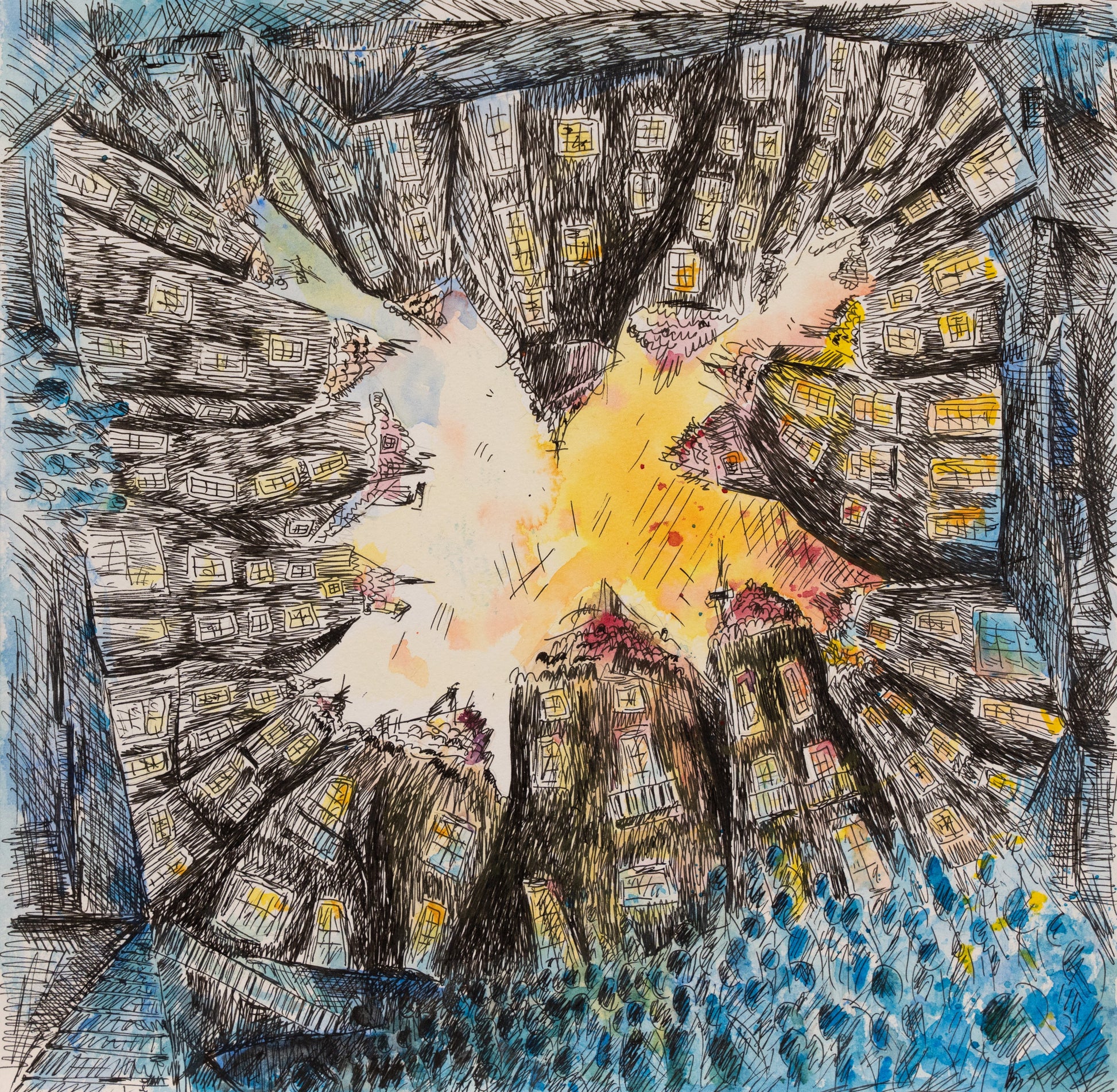 This captivating artwork looks up towards a cityscape that encircles the viewer, converging at the center where the sky breaks through. The energetic lines and vibrant colors convey a sense of dizzying height and bustling urban life.