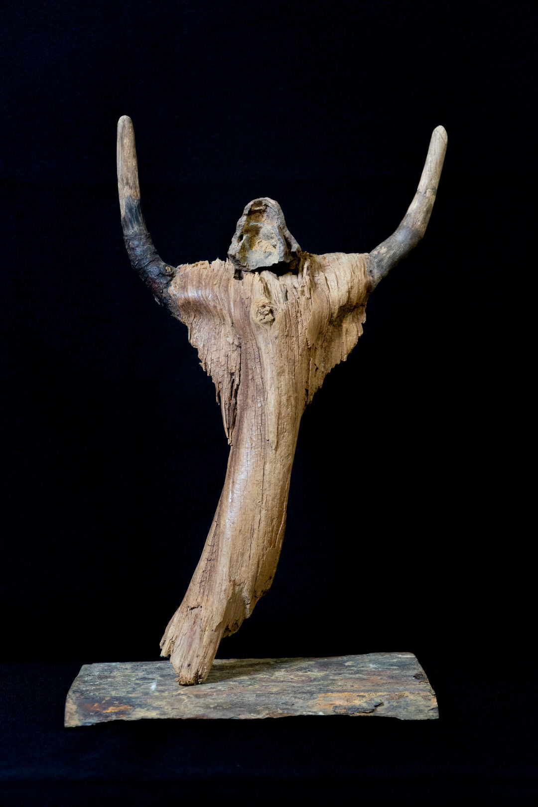 This sculpture crafted from aged wood that echoes the form of a figure with outstretched arms, as if reaching towards the sky in reverence. The weathered textures and organic shape of the piece evoke a sense of ancient wisdom and primal connection to the earth. This sculpture captures the raw beauty and strength found in natural materials, reminding viewers of the enduring spirit that inhabits the forest. It stands as a testament to nature’s resilience and the profound simplicity of organic forms.