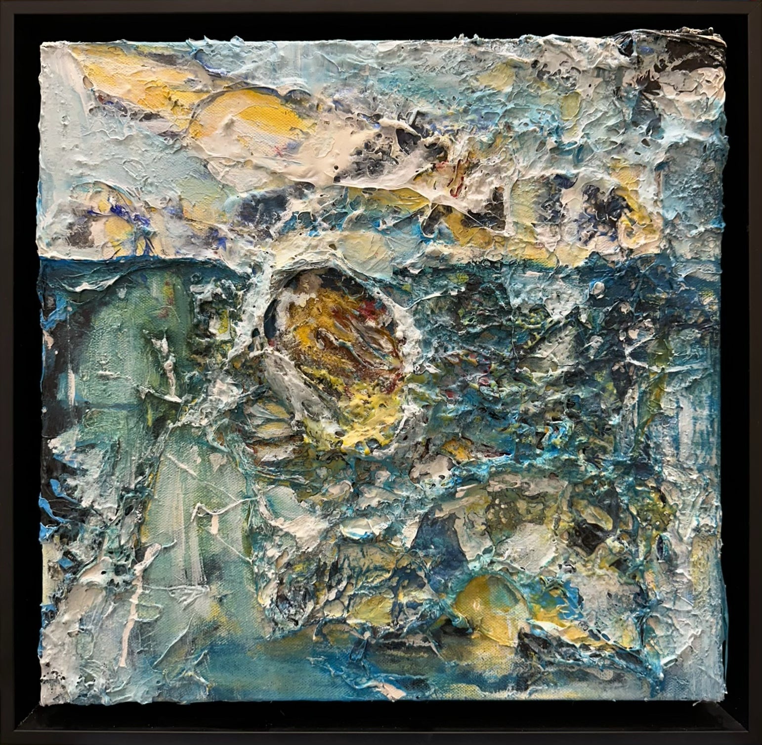 Davide Susca presents us with this dynamic abstract painting with thick, textured brushstrokes that create a sense of movement and energy. The piece features a blend of blue, white, and yellow tones, evoking the feeling of crashing waves and splashes of water.