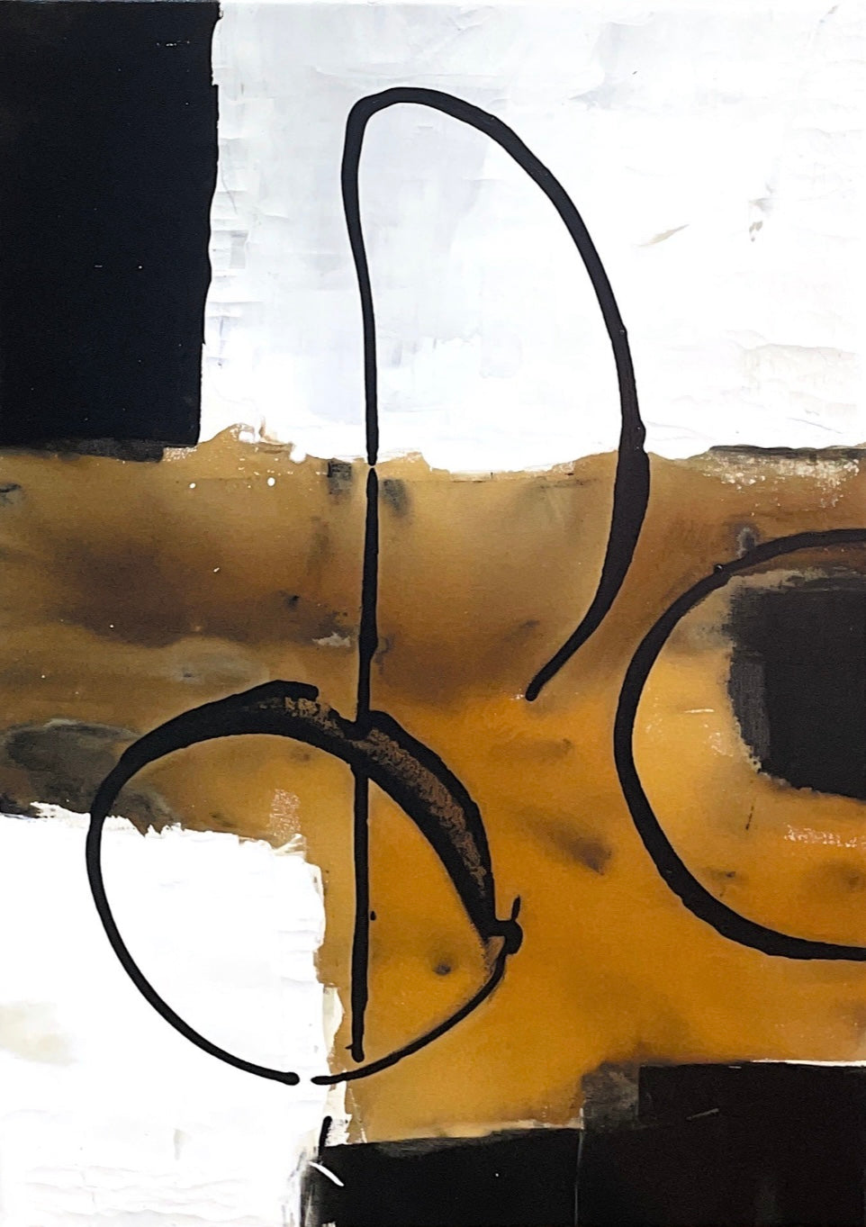 This abstract painting features bold, sweeping lines and shapes in black and earthy tones against a contrasting white background. The interplay of geometric forms and fluid lines creates a dynamic composition, evoking a sense of balance and movement. The simplicity and elegance of the design encourage viewers to find their own meaning and interpretation.