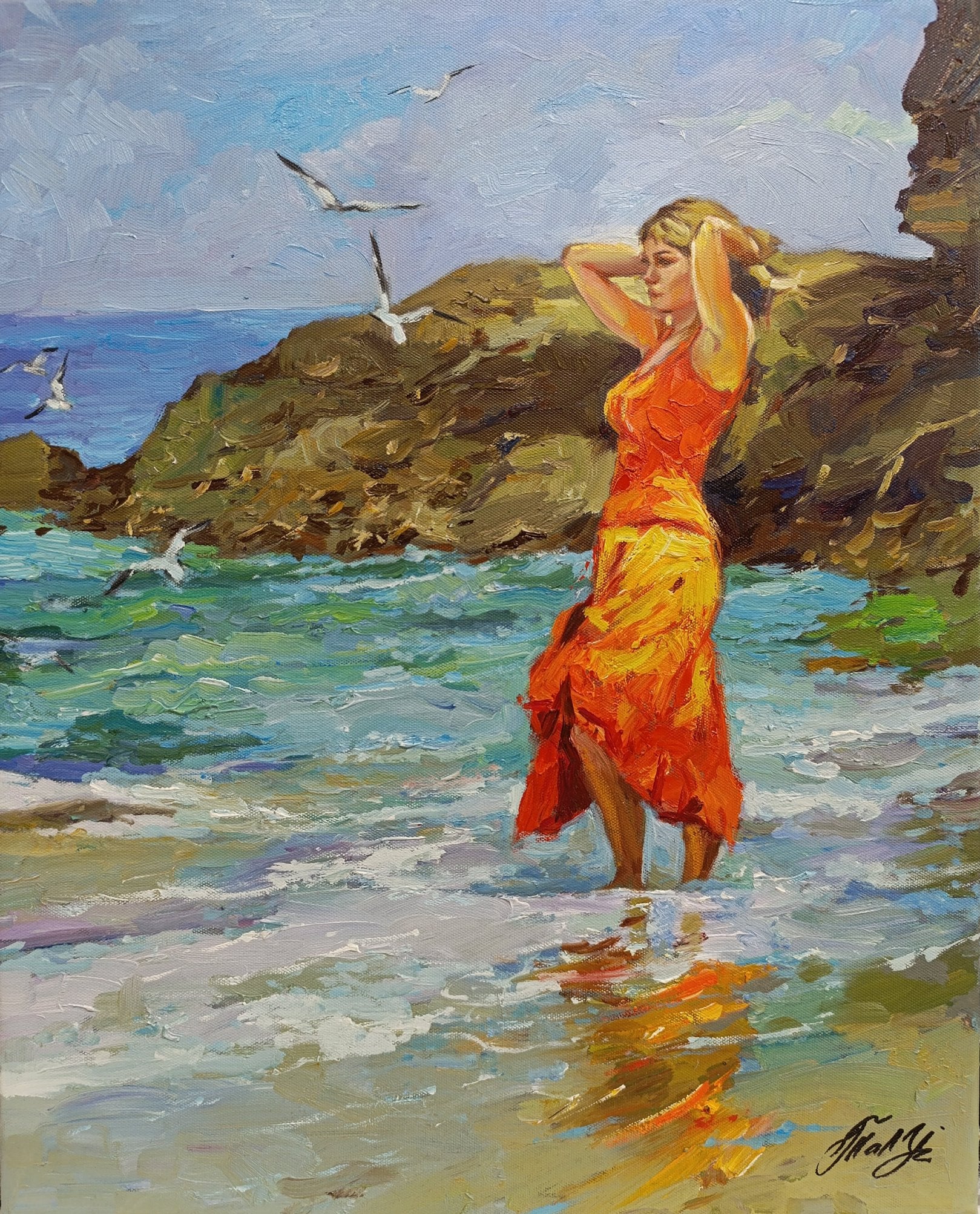 This painting captures the essence of a carefree moment by the sea, featuring a lady standing in the shallow waves, her bright dress reflecting the sunlight. The expressive brushstrokes and lively colors bring the scene to life, evoking the warmth of a summer day and the soothing sounds of the ocean. Perfect for adding a touch of coastal charm and serene energy to any space, this piece invites viewers to feel the freedom and joy of a beachside escape.