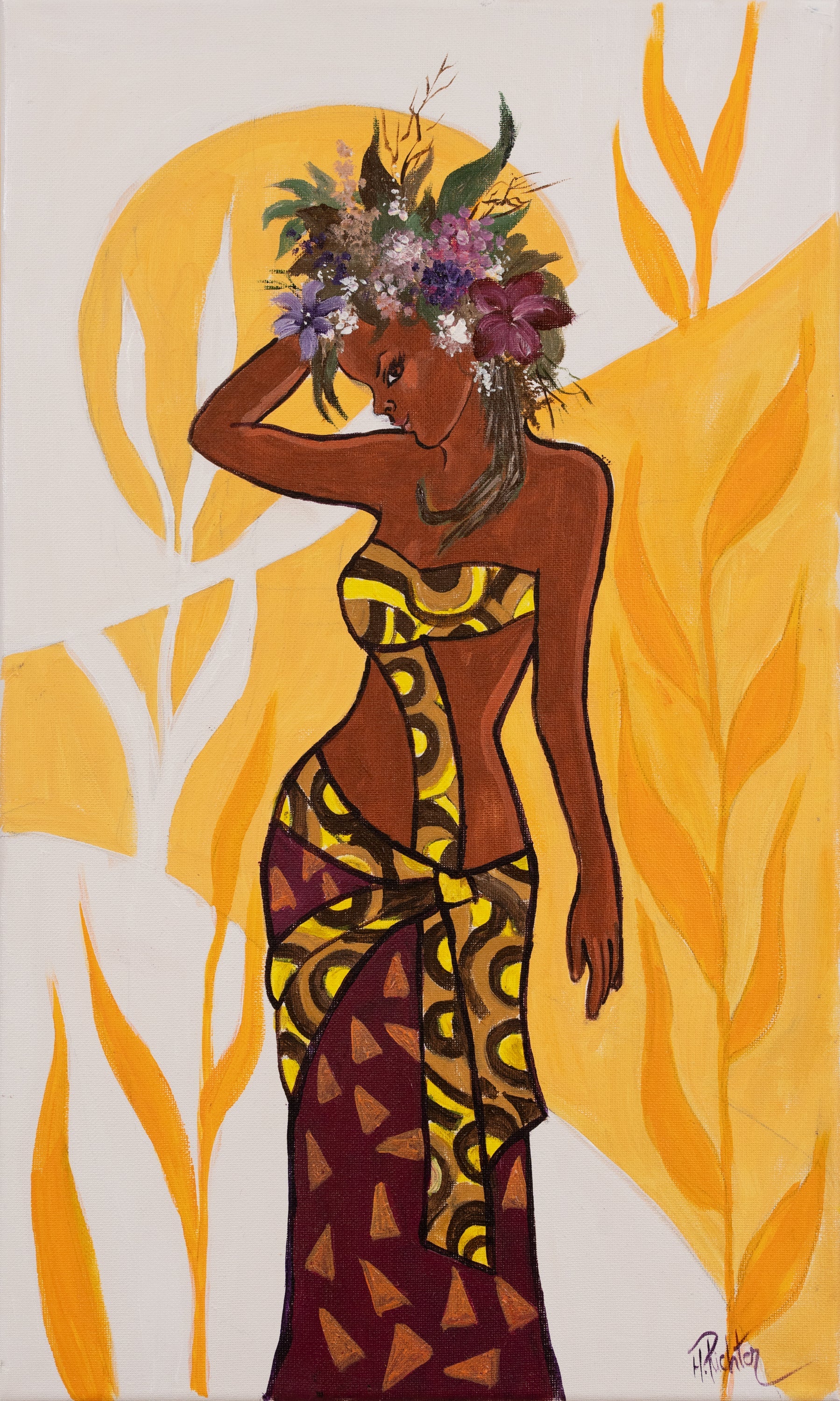This painting captures a contemplative moment, as the figure strikes a pose against a backdrop of golden hues, reminiscent of a setting sun. The rich, warm colors create a soothing atmosphere, while the intricate patterns on the garment add a dynamic element to the composition. This artwork merges traditional influences with modern aesthetics, offering a deep, contemplative look into the themes of introspection and personal growth. The striking use of light and shadow emphasizes the emotional depth of the moment.