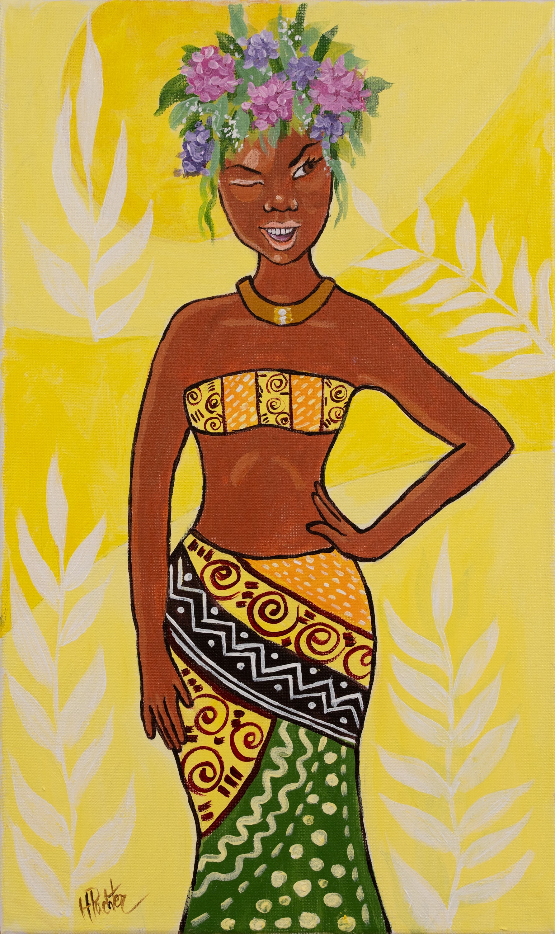 In a burst of radiant yellow, this painting depicts a joyful figure with a lush floral crown, surrounded by abstract leaf motifs. The warm palette and the subject’s playful expression convey a feeling of happiness and vitality. The simplified forms and the vivid contrast of colors enhance the visual impact, making it a powerful statement piece that celebrates joy and the vibrancy of life. The artwork’s lively energy is infectious, inviting viewers to embrace a positive, sunny outlook.