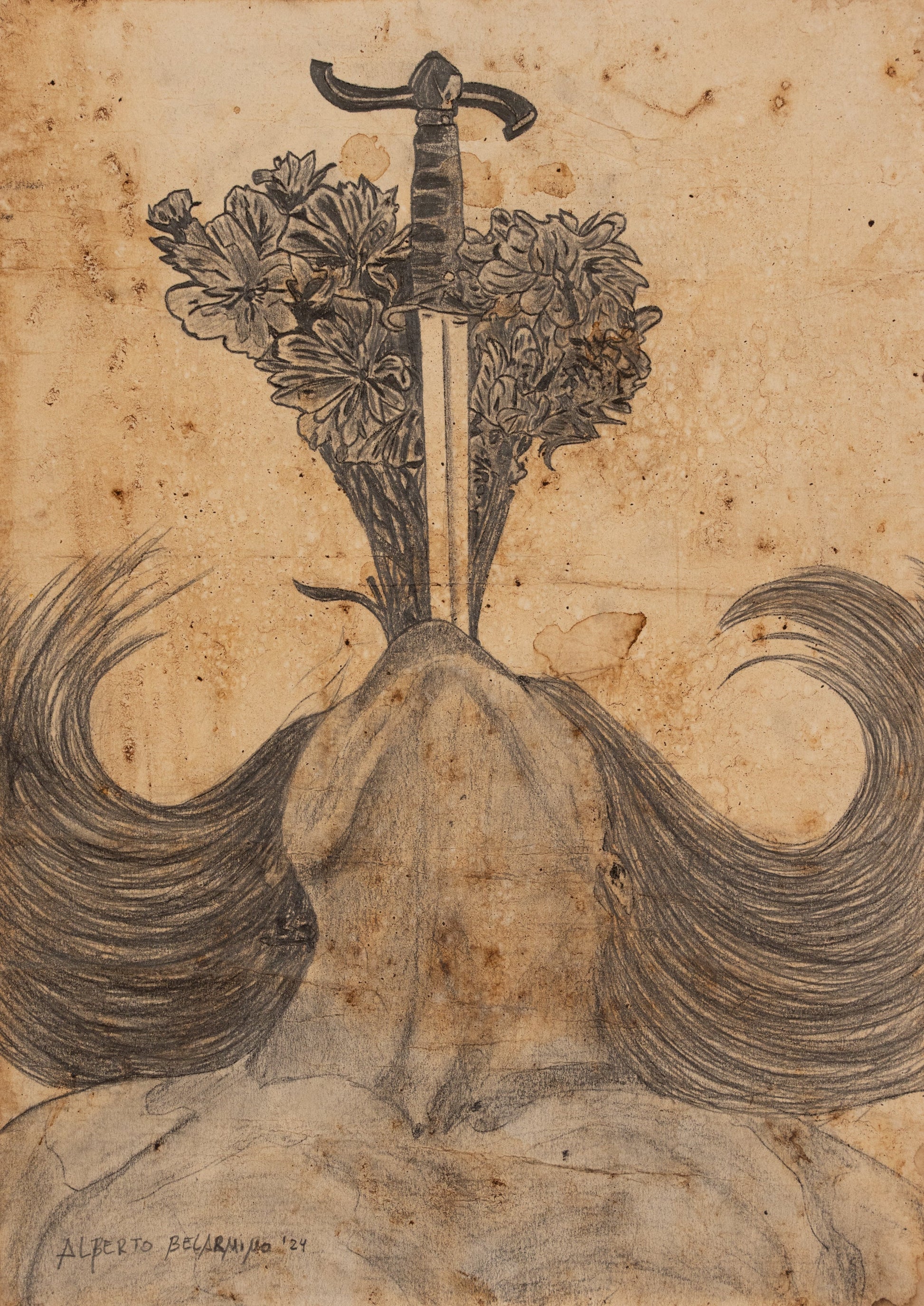 This powerful composition features a sword surrounded by blossoms, emerging from the back of a woman's head. The image suggests themes of strength and fragility, combining elements of the natural and the crafted.