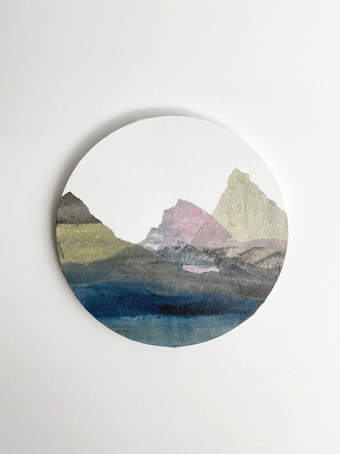 This piece belongs to the Taliscas series, a collection that captures the serene essence of mountainous landscapes through layered textures and soft, natural hues. Crafted on a round cotton canvas, this piece employs hand torn paper collage to capture a mountainous scene it reflects a minimalist yet immersive interpretation of nature. The subtle colors blend harmoniously, inviting a peaceful and contemplative viewing experience.