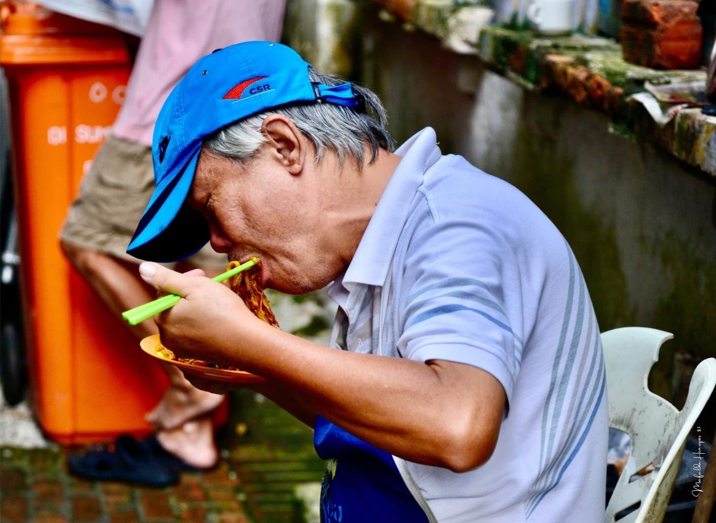 In the image, we see an Asian man sitting in the middle of a street, fully engaged in the act of having a meal. The setting is urban, yet the man appears isolated amidst the invisible motion that surrounds him. He is absorbed in the moment, with a calm and focused expression, almost indifferent to the chaos and rush we might imagine around him.