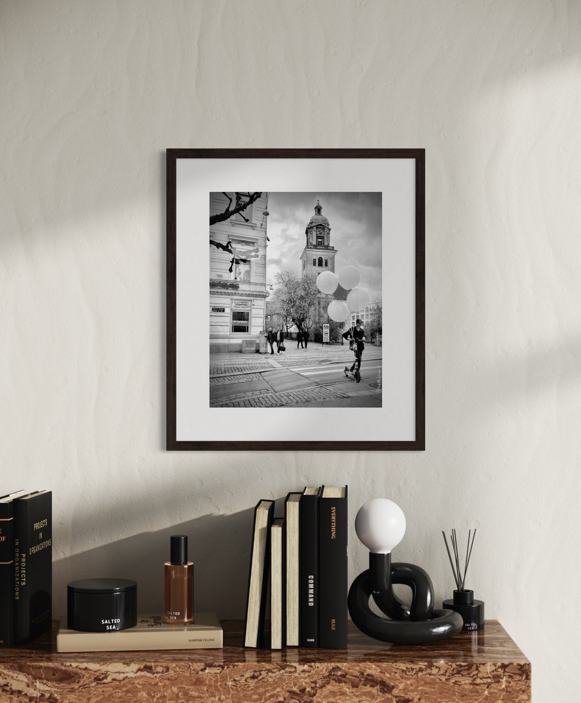 In this photo, a young boy, energetic and full of life, glides effortlessly along the pavement on his scooter. In his hand, five colorful balloons float, dancing in the wind and symbolizing the joy and innocence of childhood. The scene is framed by the majestic Domkyrka in the background, a masterpiece of architecture that proudly stands against the Gothenburg sky, like a silent guardian of the stories unfolding in the city's streets.