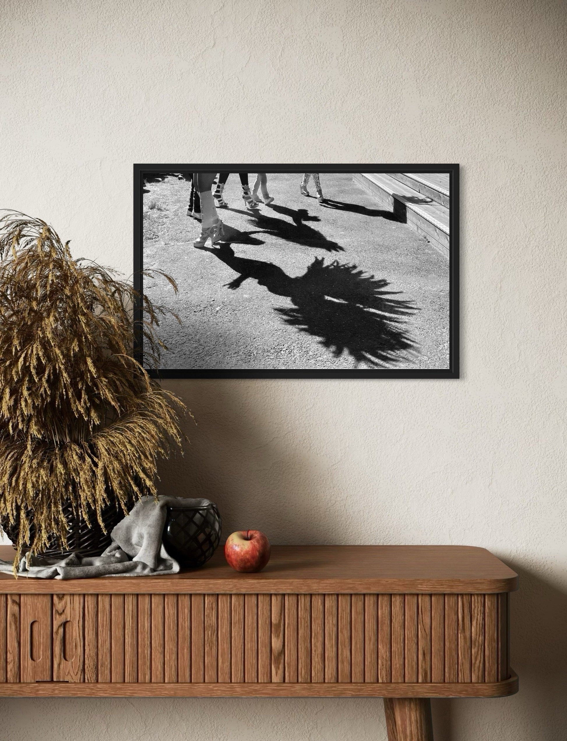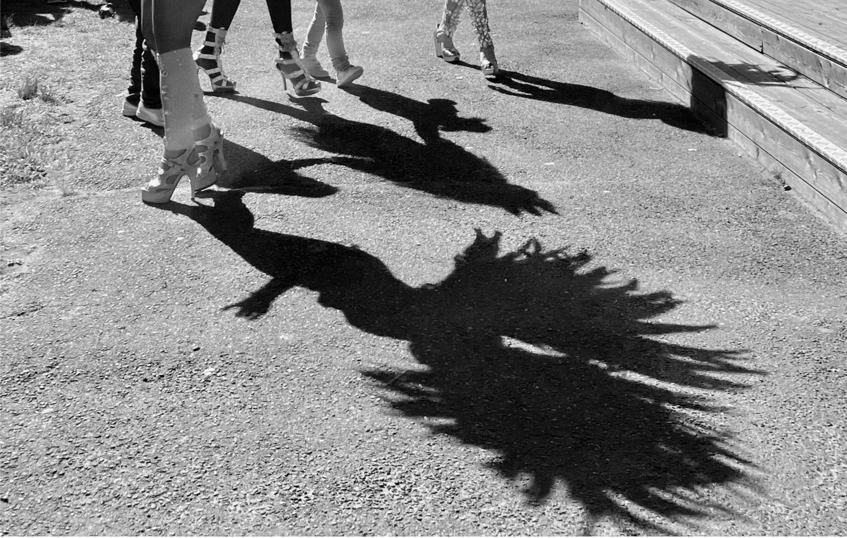 In this black-and-white photograph, the silhouettes of three women are captured, their elongated and striking shadows projected onto the ground like a silent and captivating dance. Taken during a carnival parade in Gothenburg, they emerge as spectral figures of movement and the vibrant joy that Brazilian carnival evokes, even thousands of kilometers away from its tropical roots.