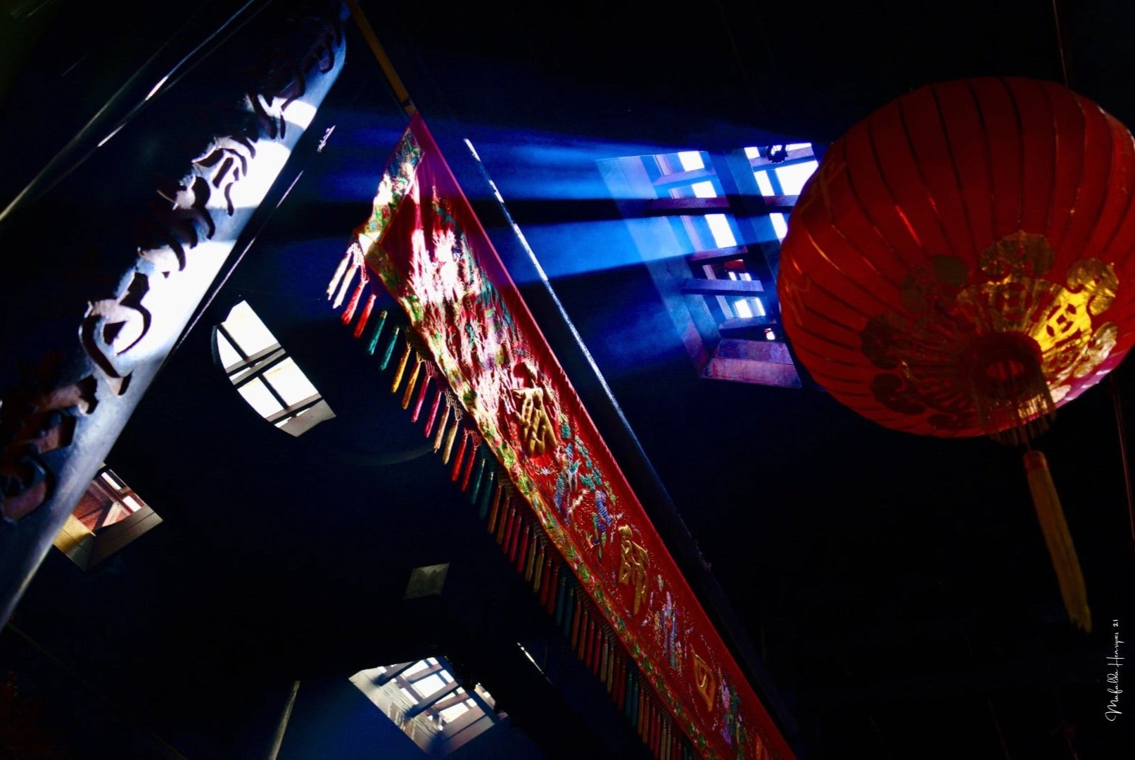 In this captured moment, the soft light streaming through the upper window of the Chinese temple illuminates the space poetically. The rays of light dance among the clouds of incense, creating an ethereal atmosphere where the sacred and the everyday intertwine. The light reveals intricate details of the architecture that might otherwise go unnoticed: the delicate carvings in the wood, the vibrant colors of the adornments, and the textures that tell stories of centuries.