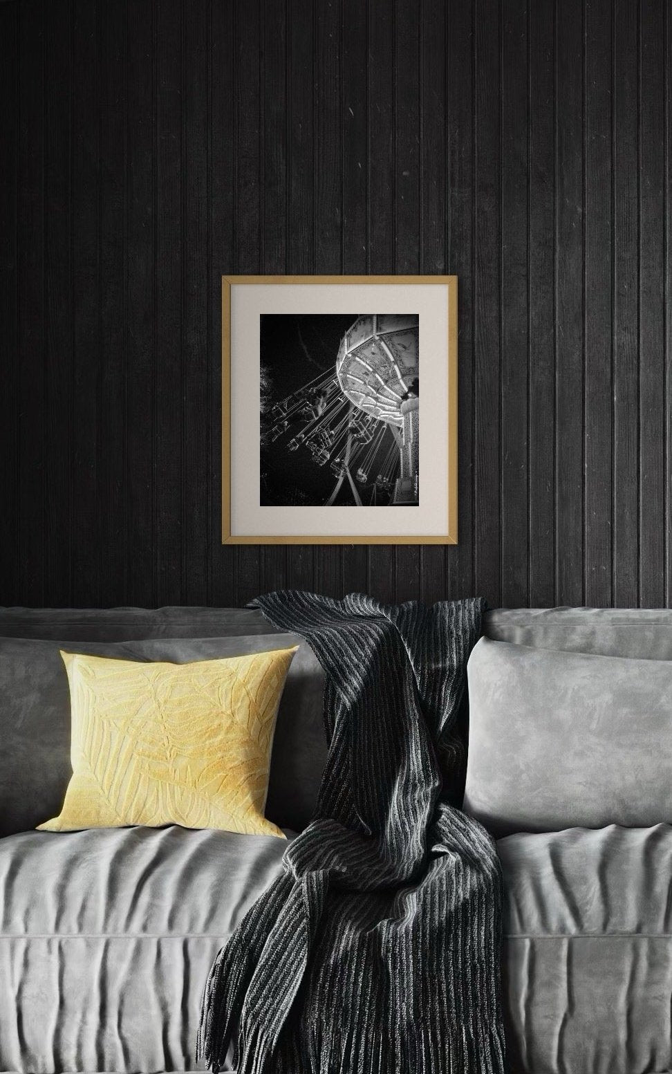 In this black-and-white photograph, the carousel at Liseberg Park in Gothenburg takes on an air of timelessness. Without its vibrant colors, we are left with the shapes and the contrasts of light and shadow that capture the circular motion of the suspended chairs in an almost hypnotic spin. The lights, though devoid of color, shine intensely against the surrounding darkness, giving the carousel an aura of nostalgia and mystery.