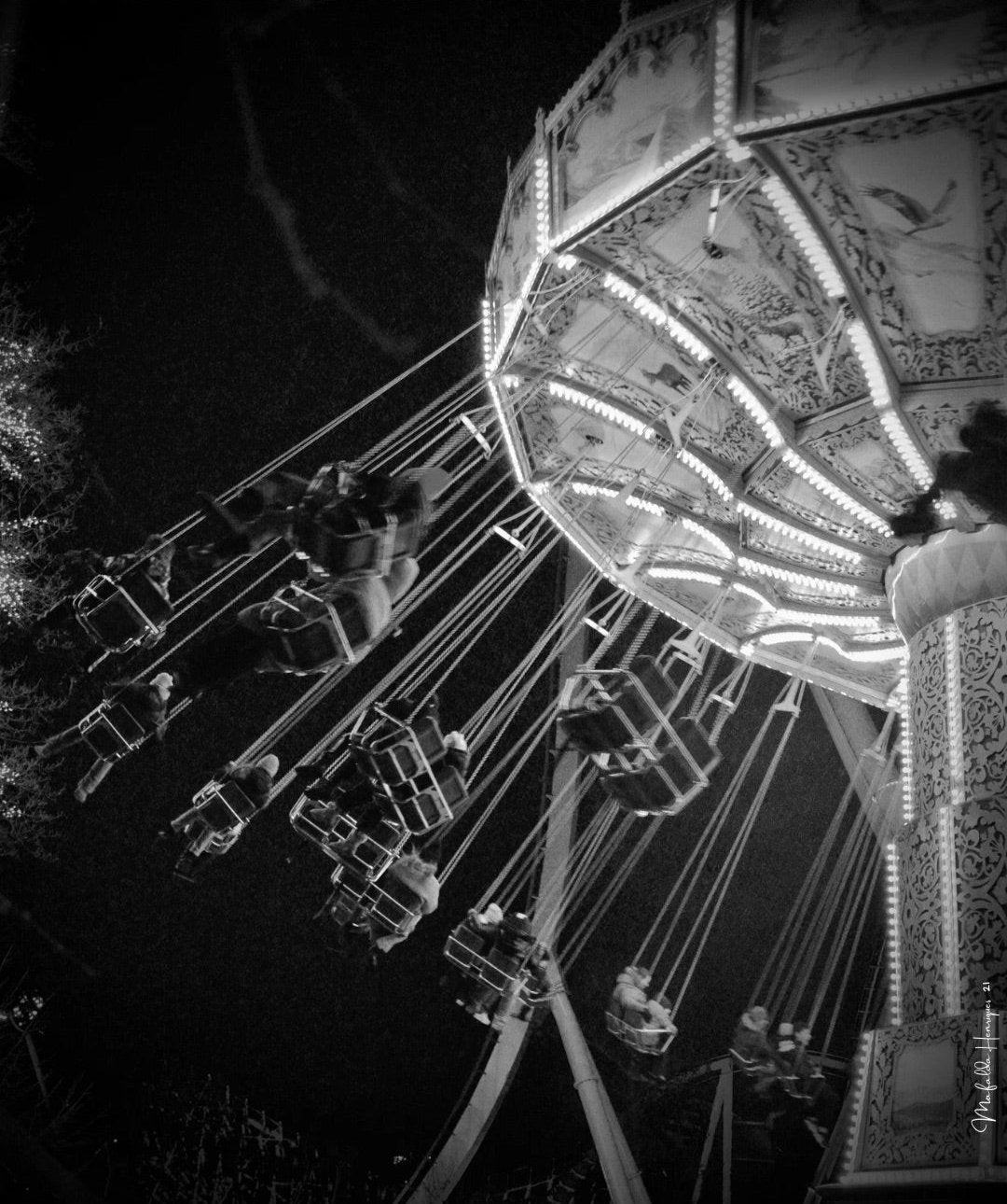 This black-and-white scene invites us to look beyond the surface, to see the beauty in the details, and to reflect on the cyclical nature of time. The carousel, spinning endlessly, symbolizes life's turns and the inevitable return to our own memories, which, like the lights in this photograph, continue to shine in the depths of our recollections, even without their original colors.