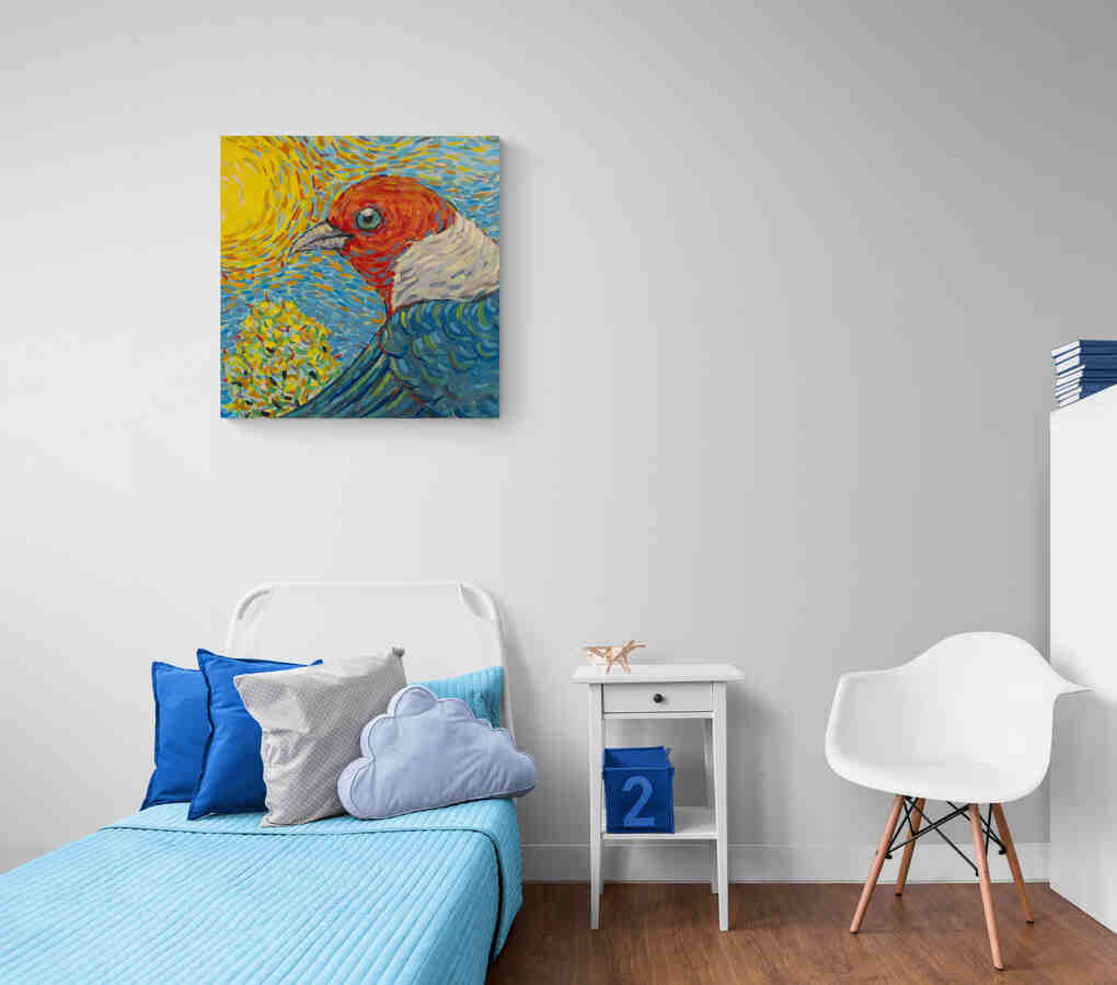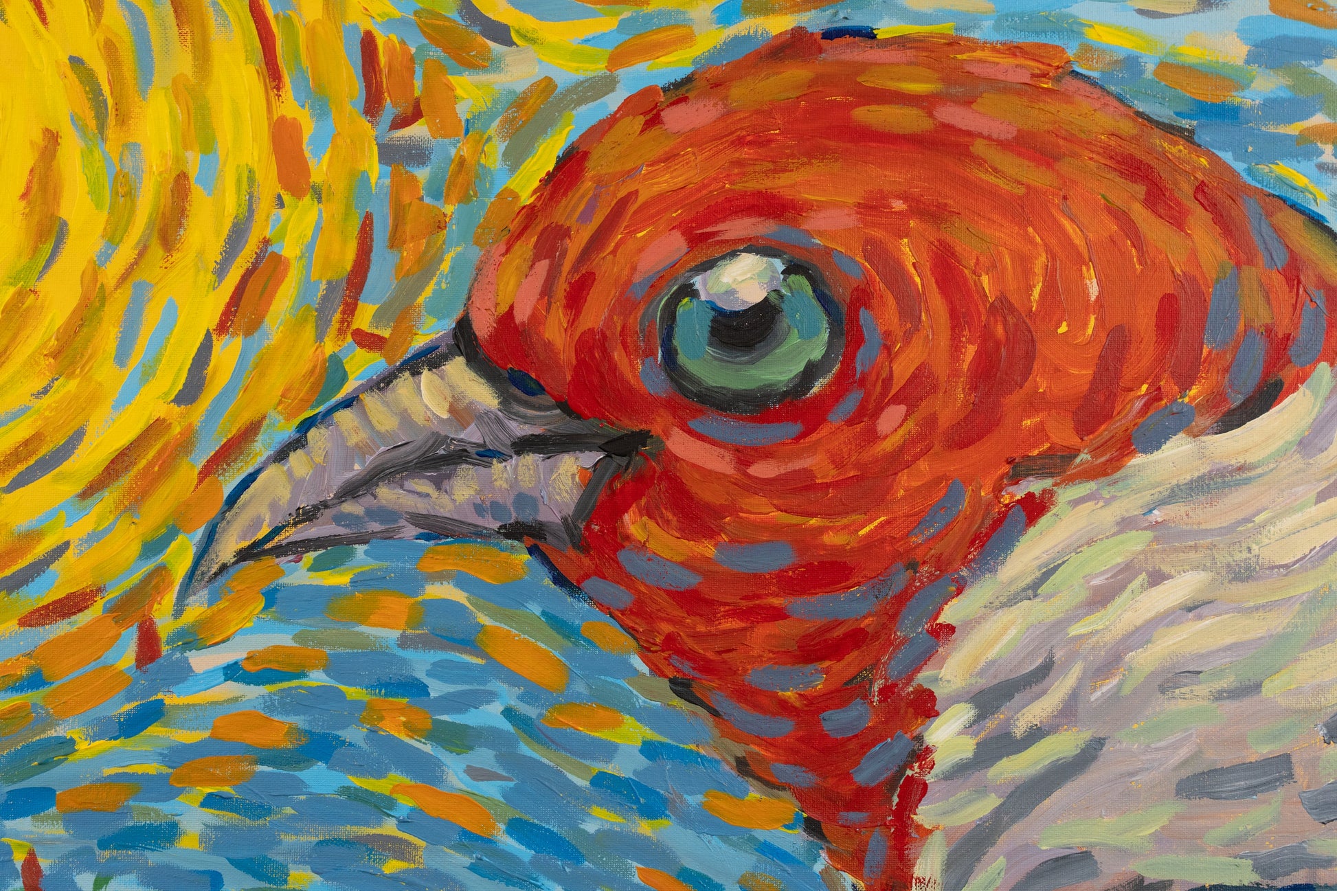 This painting captures a bird in a moment of serene observation, set against a swirling backdrop reminiscent of Van Gogh's vibrant sky. The bold red and white plumage contrasts beautifully with the blue and yellow strokes that compose the lively environment. This piece utilizes a thick, impasto technique, where the paint is applied in heavy, tactile layers that give the artwork a dynamic, almost three-dimensional effect. The eye of the bird, clear and reflective, serves as a focal point, inviting the viewer into a moment of shared connection with nature.