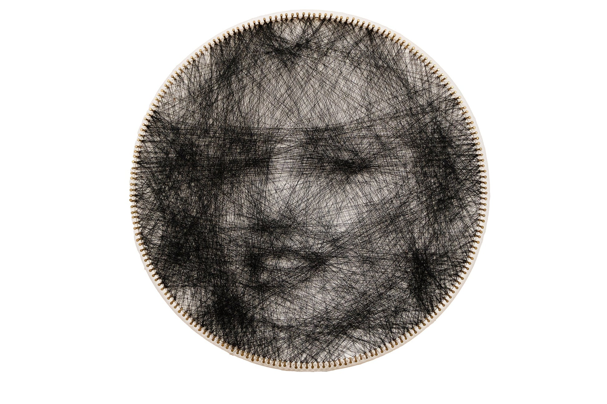 "Threaded Essence" is a captivating sculpture that portrays a human face using an intricate web of black threads stretched across a circular frame. The delicate interweaving of the threads creates a hauntingly realistic and ethereal image, evoking a sense of mystery and introspection. The meticulous technique showcases the artist's skill in transforming simple materials into a profound visual experience.
