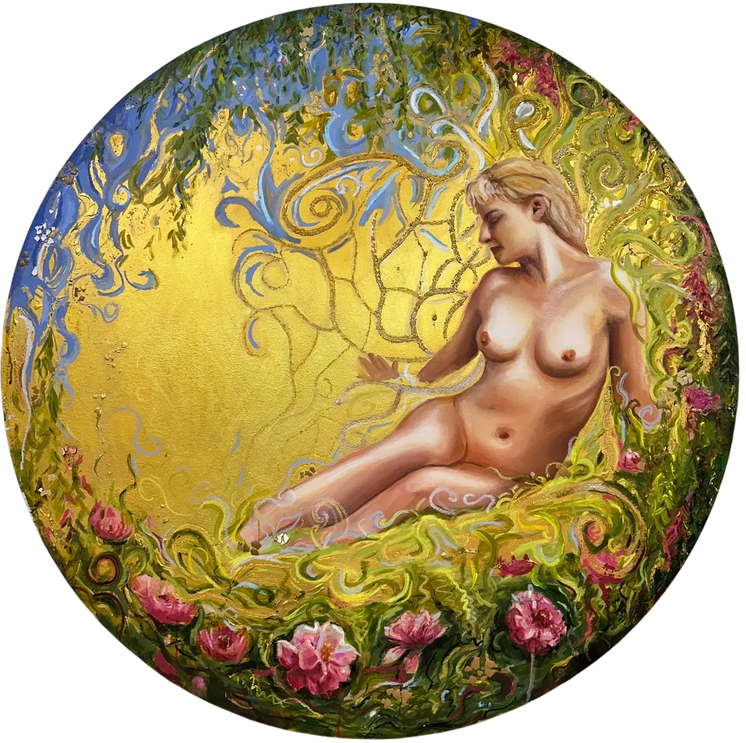A radiant circular painting portraying a reclining nude figure entwined with swirling vines and blossoms, highlighting nature’s harmonious interplay and a serene, introspective mood.