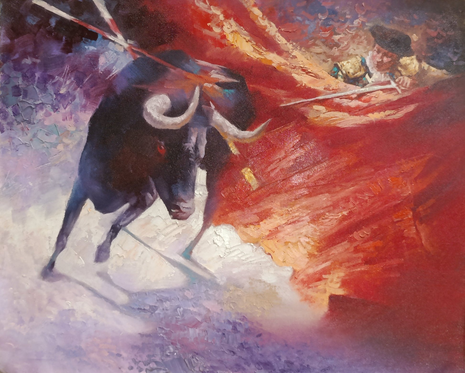 Moment of confrontation between a matador and a charging bull, set against a vibrant backdrop of red and purple hues. The artist’s bold brushstrokes and dynamic use of color convey the tension, movement, and energy of the bullfight, drawing viewers into the heart of the action. Ideal for those who appreciate the art of bullfighting or the thrill of powerful, expressive artwork, this piece makes a bold statement and adds a sense of passion and excitement to any space.