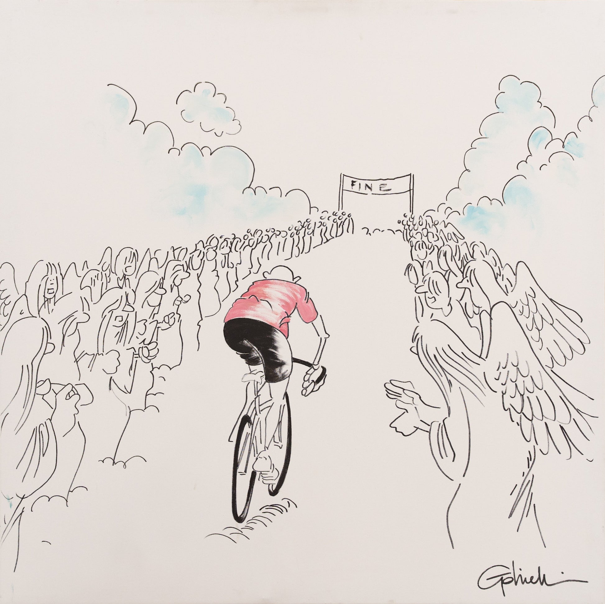 In this evocative ink and watercolor piece, the artist captures the triumphant moment of a cyclist nearing the finish line, surrounded by cheering angels. This ethereal crowd, their wings softly shaded in delicate gray tones, represents perhaps the spirits of past champions or symbolic guardians, applauding the cyclist's perseverance and strength. The use of minimal color highlights the cyclist’s vibrant jersey, emphasizing the physical strain and emotional elation of this final sprint. This drawing not only celebrates athletic achievement but also subtly suggests a transcendent journey, transcending the mere physicality of the sport.