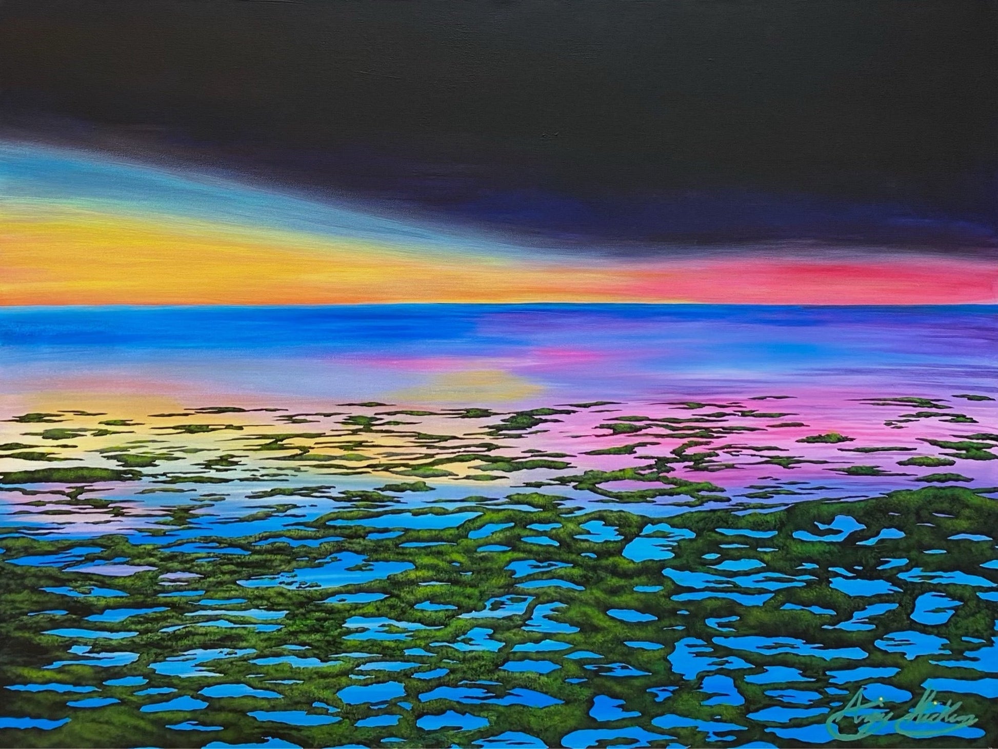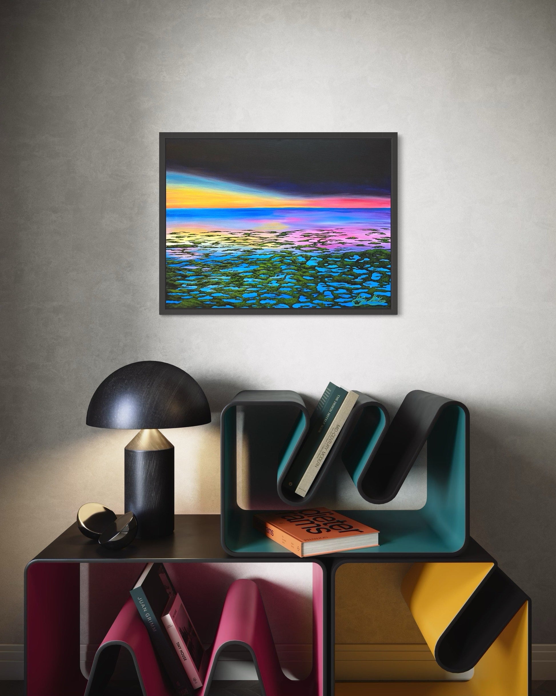 A captivating landscape that captures the serene transition between water and sky at dusk. The painting explores a vibrant palette of colors, with deep blues, vivid greens, and touches of magenta, orange, and yellow that melt into the horizon, creating a dramatic yet peaceful sunset scene. The interplay of light and shadow, along with the reflection of colors on the calm water, gives the piece a sense of depth and movement. This artwork evokes a feeling of calm and reflection, inviting viewers to immerse themselves in its tranquil beauty.
