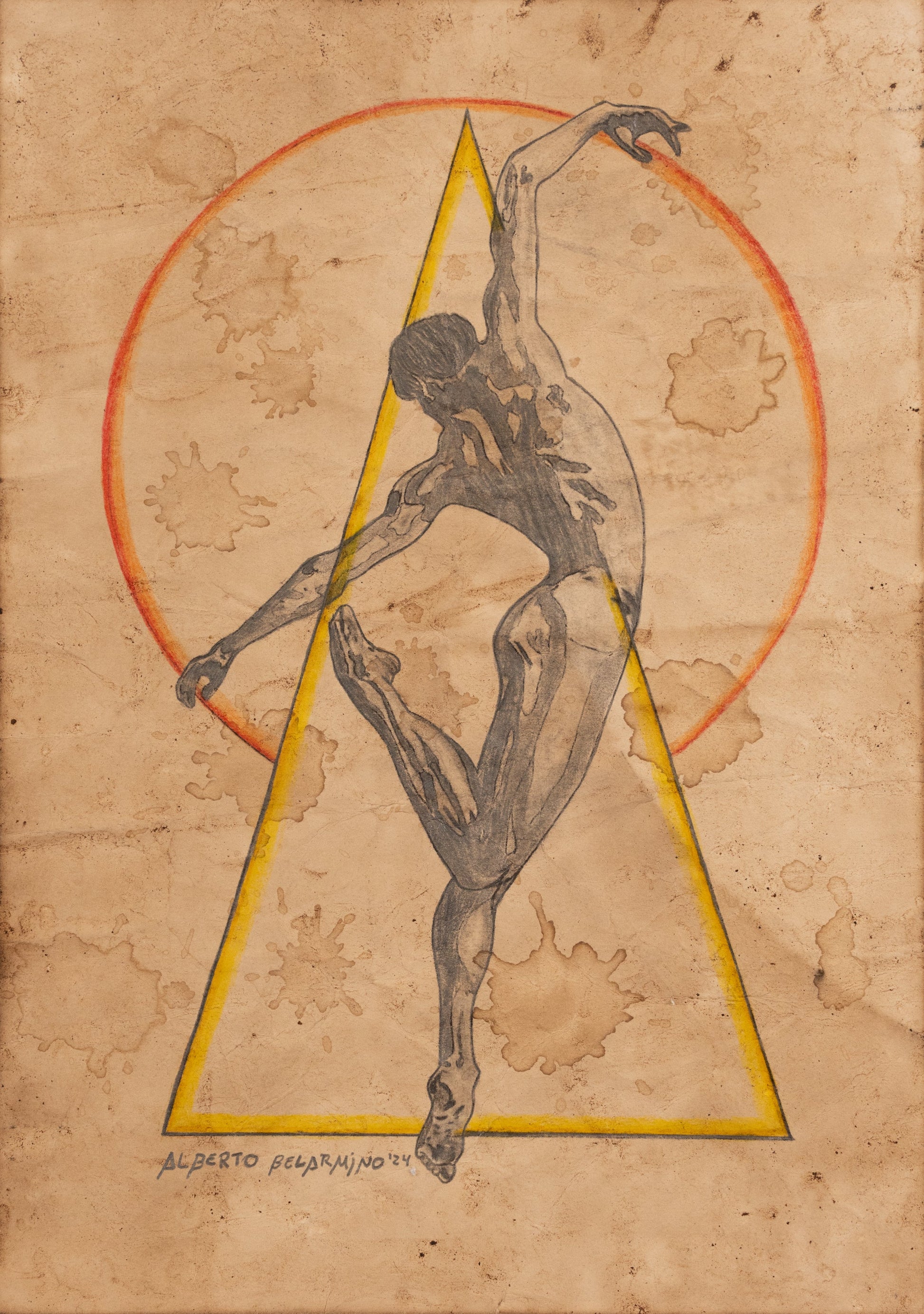 This dynamic drawing places a figure within geometric shapes, suggesting a complex balance between human form and abstract elements. The use of minimal color highlights the striking physicality of the pose.