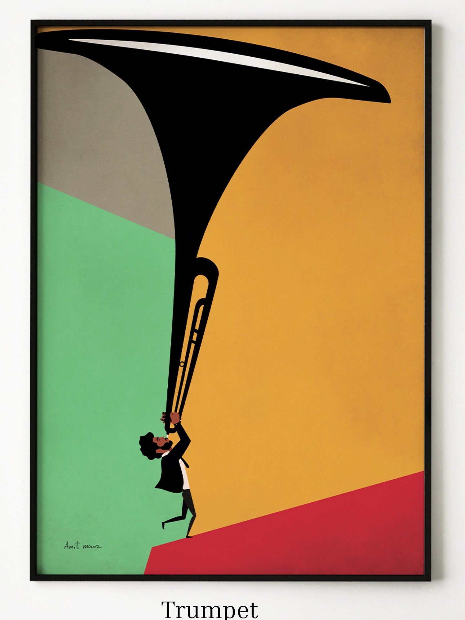 A dynamic modern illustration featuring a musician playing an oversized trumpet, which dominates the composition with its sweeping form. The vibrant geometric background of green, orange, and red adds a sense of rhythm and motion, emphasizing the boldness of the brass instrument.