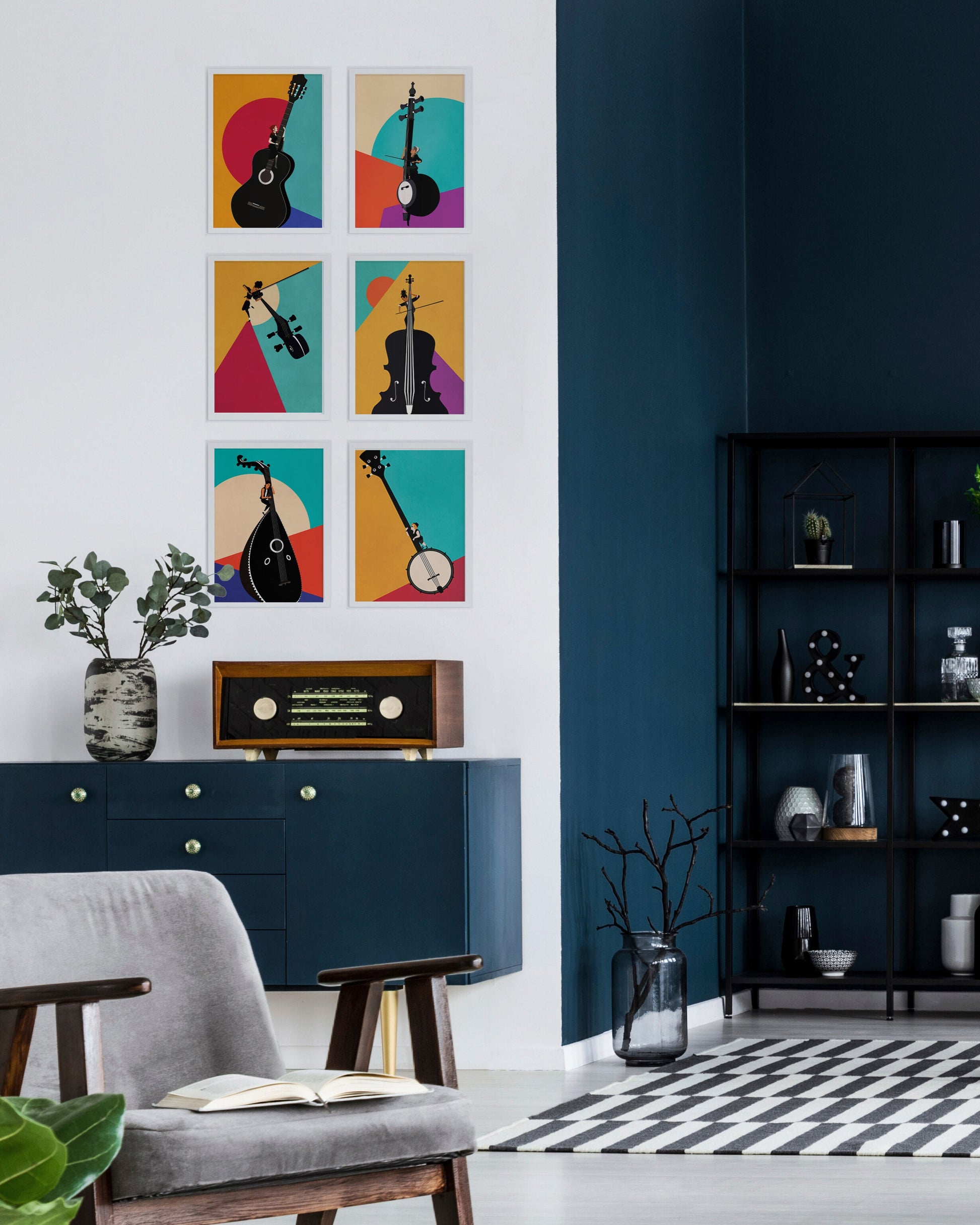 The minimalist design and strong color contrasts emphasize the power and joy of brass instruments.