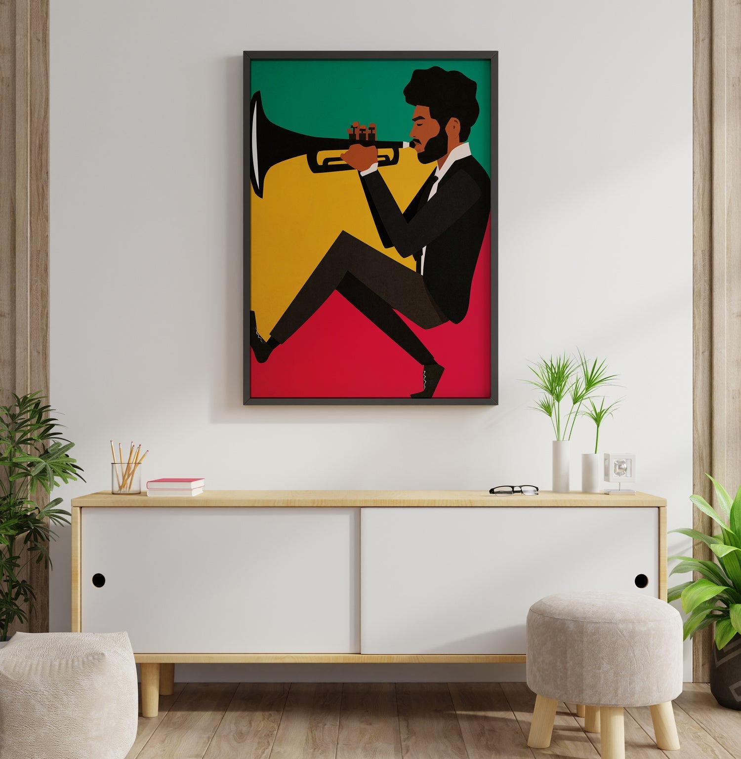 A dynamic, modern illustration depicting a trumpet player in a sleek black suit, fully immersed in his performance. The bold geometric background of green, yellow, and red enhances the energy and passion conveyed through his music.