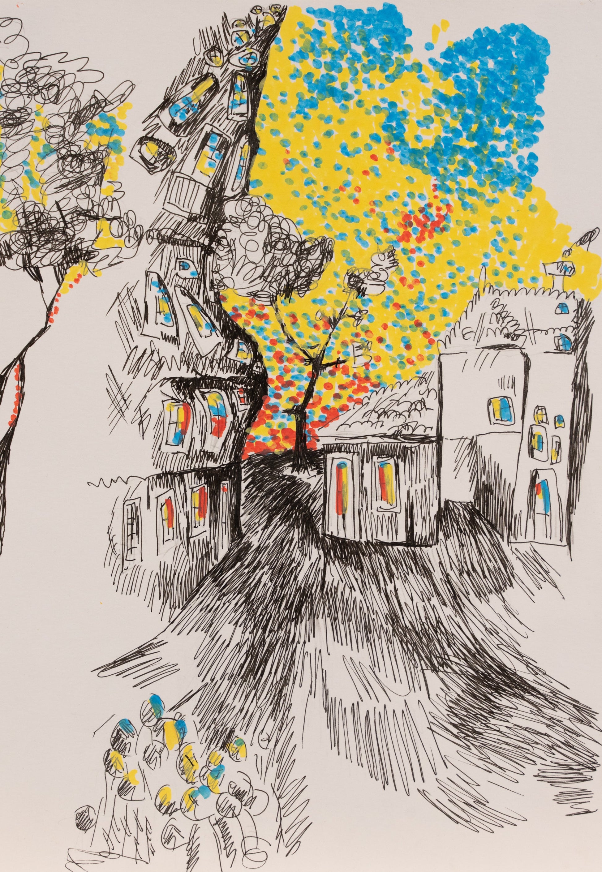 This drawing showcases a quaint village at twilight, where the vibrant colors of the setting sun cast a warm glow over the houses. The whimsical, almost dreamlike quality of the scene is enhanced by the playful use of colors and intricate details.