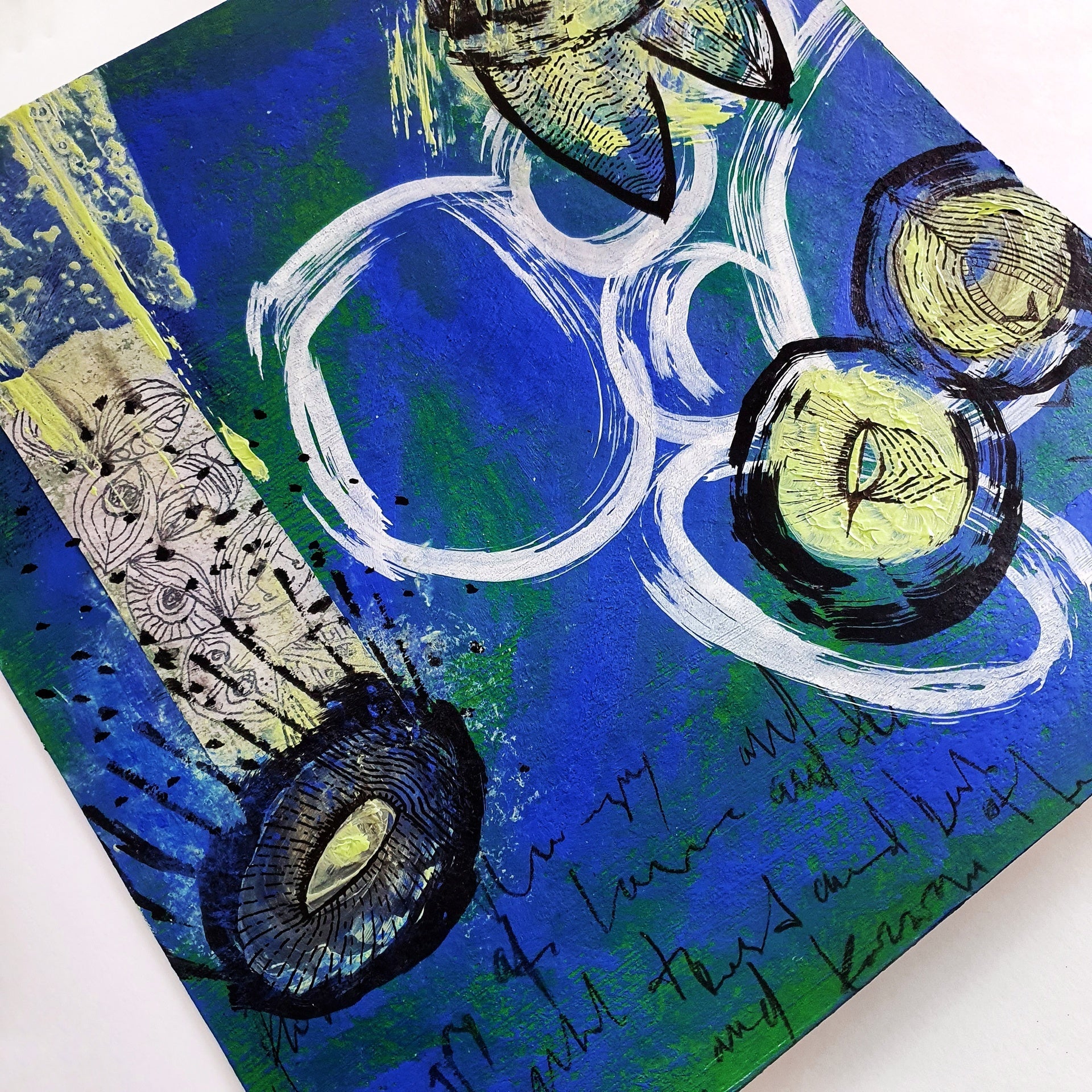 The work embodies elements of abstract expressionism, characterized by spontaneous brushwork, and the incorporation of graffiti-like text adds a contemporary urban feel.