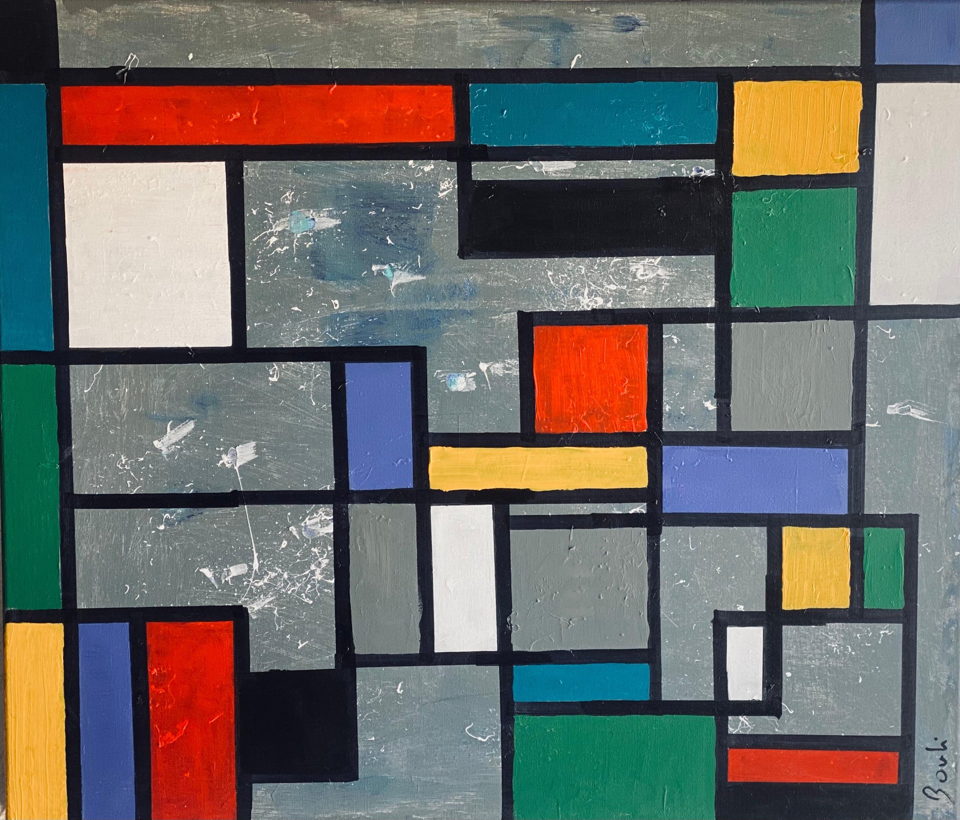 A rhythmic interplay of colour and space, “Urban Gridlock” channels city energy into a geometric symphony. Order meets spontaneity in this bold visual structure.