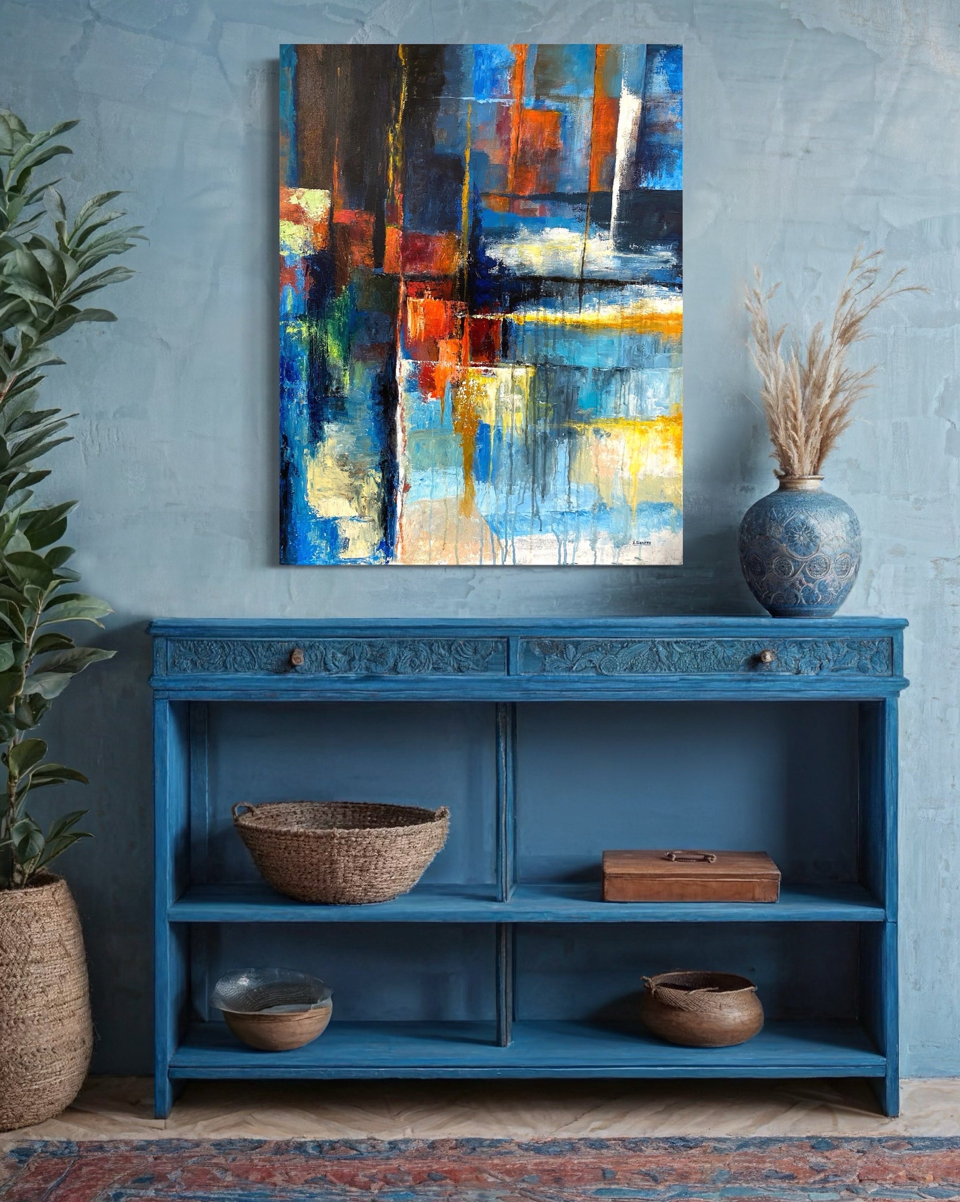 A striking abstract piece that captures the essence of a bustling cityscape through bold strokes, vivid colors, and layered textures. The interplay of blues, oranges, and reds evokes the lights and shadows of an urban environment, while the vertical and horizontal lines suggest towering buildings and streets. Paint drips and blended hues mimic reflections on wet surfaces, as if one is looking at the city mirrored in a rainy pavement. This piece invites viewers to dive into the vibrant energy of urban life, highlighting its beauty amid chaos and motion.