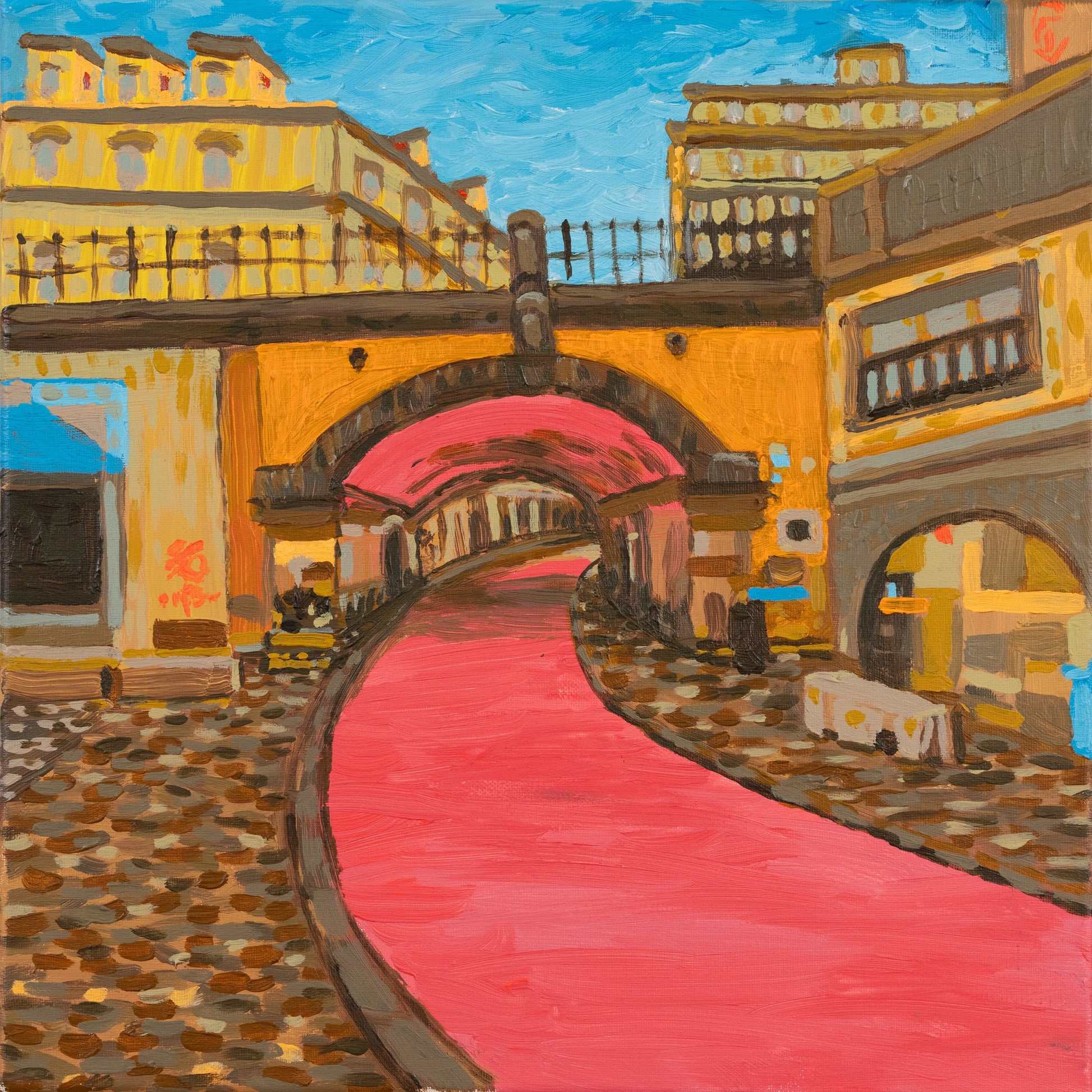 Capturing the serene yet bustling vibe of an urban landscape at dusk, this painting uses a palette of warm oranges and pinks to highlight the romantic architecture of a cityscape, possibly inspired by a place like Venice with its iconic bridges and reflective waters.