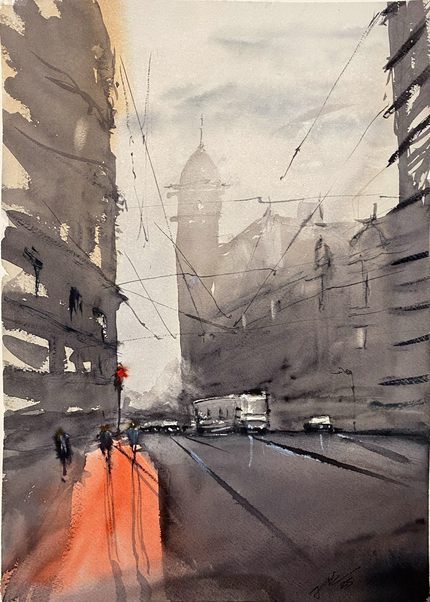 A moody, atmospheric cityscape in watercolour, capturing the essence of movement and urban stillness in a single moment. With minimal yet expressive strokes, the piece evokes the rhythm of daily life, framed by historic architecture and intersecting trolley wires.