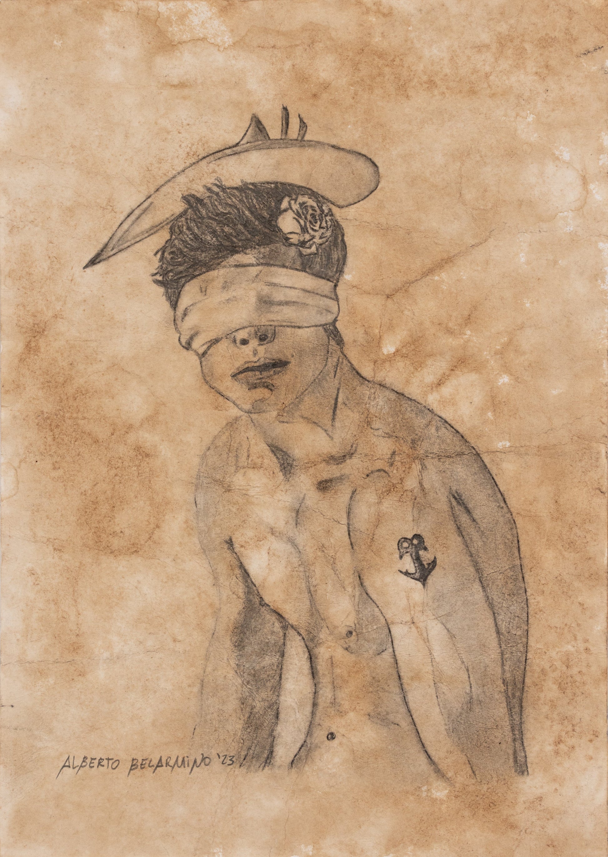 This artwork intriguingly blends symbolism and portraiture, depicting a figure with a blindfold, topped with a sunhat adorned with a rose. The blindfold suggests themes of obscured vision or unseen realities, while the rose adds a touch of natural beauty, hinting at hidden depths and the complexity of perception. The detailed execution of the figure’s torso, showing a tattoo of a smaller figure, further plays with the idea of layers and inner stories.