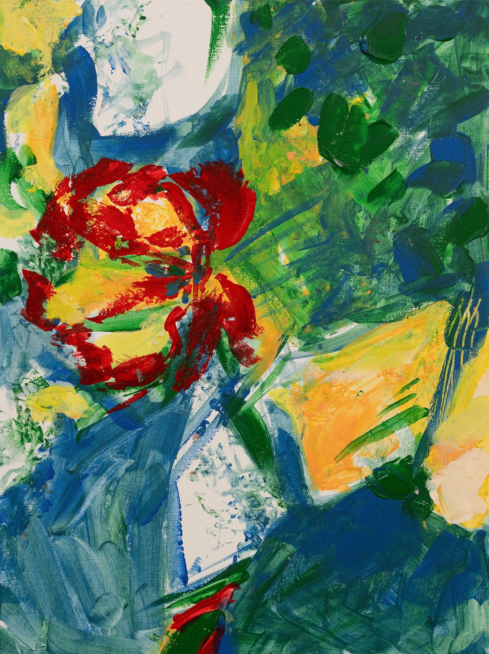 This abstract painting bursts with the vibrant energy of a flourishing garden. Dominated by bold strokes of green, red, yellow, and blue, the composition evokes the lushness and vitality of nature. The interplay of colors and textures creates a dynamic and lively atmosphere, capturing the essence of a garden in full bloom.