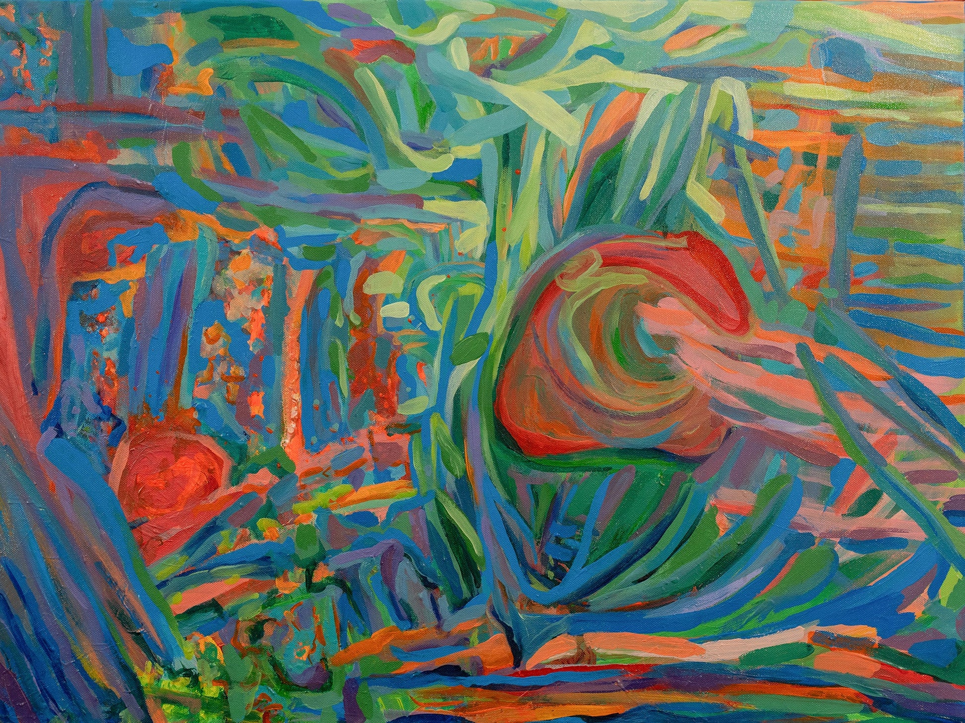 This dynamic painting features a vibrant whirl of colors and abstract forms, creating a sense of energetic movement and depth. The interplay of bright blues, greens, and reds with contrasting lines and shapes evokes a lively, almost musical composition that draws the viewer into its swirling patterns.