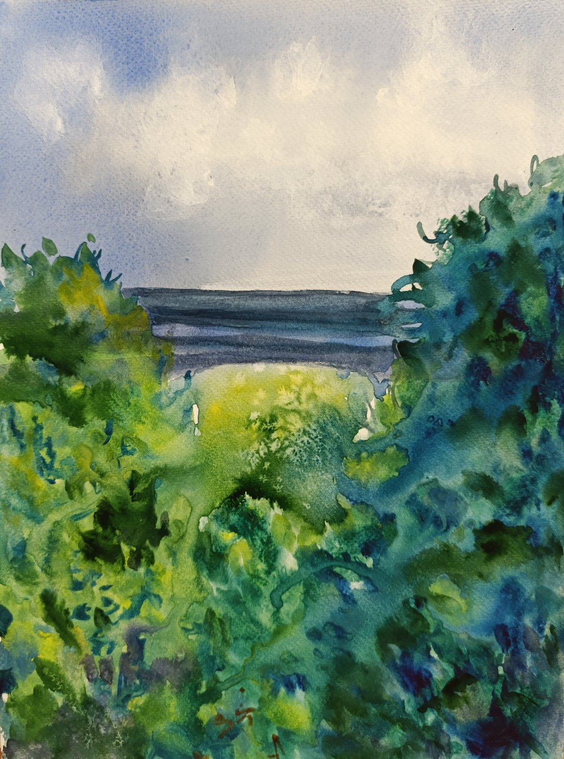 A refreshing watercolor painting that captures the vibrant beauty of a lush garden with a distant view of the sea. The rich greens of the foliage frame the composition, creating a natural window through which the calm, blue water can be seen stretching toward the horizon. The artist skillfully uses washes of color to depict the soft, rolling textures of the leaves and branches, while the sky above is light and serene, with hints of clouds. This piece evokes a sense of tranquility and connection to nature, making it perfect for anyone who finds peace in outdoor landscapes.