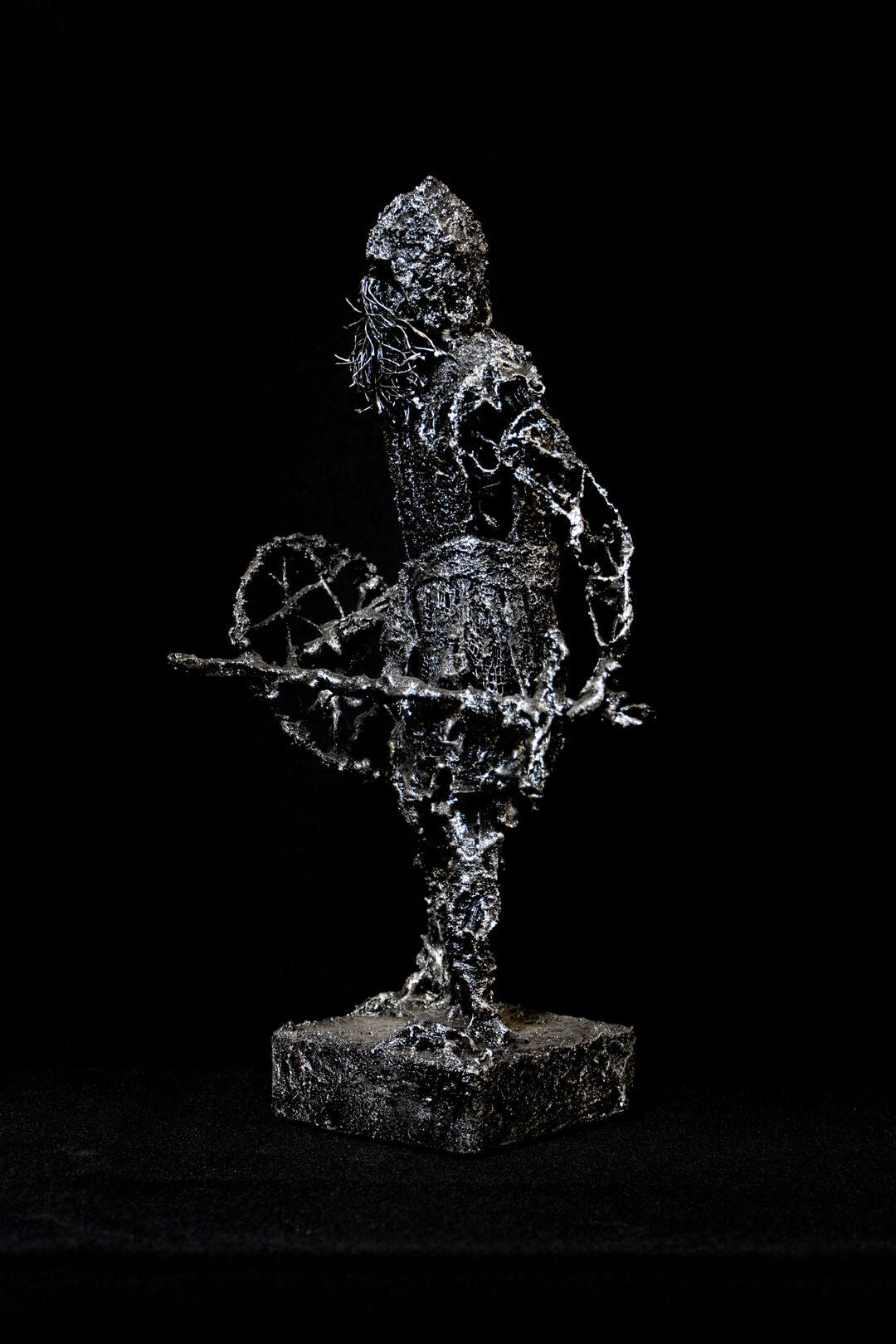 A hauntingly powerful sculpture that captures the essence of a battle-worn figure emerging from darkness. Crafted with intricate detail, the textured surface and imposing stance exude strength and resilience, while the figure’s faceless, armored appearance imbues it with a sense of timeless mystery. This piece invokes the spirit of an ancient guardian, standing solemnly as a symbol of courage, endurance, and the silent resolve of warriors throughout history. The rough, almost fragmented surface adds to its rugged allure, as if it has survived countless encounters and remained steadfast.