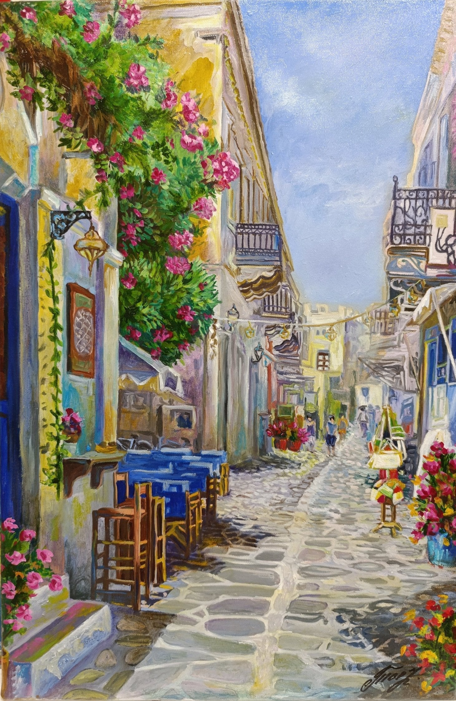 The scene is alive with the vibrant colors of blooming flowers that cascade down the walls of quaint, weathered buildings. The narrow cobblestone street, lined with rustic wooden chairs and tables outside inviting cafés, leads the eye toward a distant horizon where the everyday life of the town gently unfolds. The warm, golden light of the afternoon sun bathes the street in a soft glow, creating a harmonious blend of light and shadow.