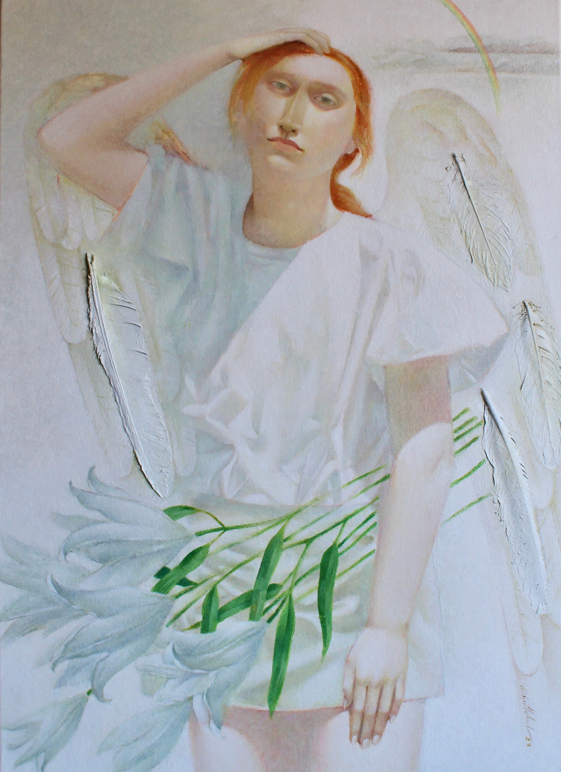 This painting combines a realistic depiction of a human figure with fantastical elements, such as the angelic wings and the ethereal, almost translucent quality of the attire and the wings. This blend of the real and the surreal creates a dreamlike atmosphere that is hallmark to Magical Realism.