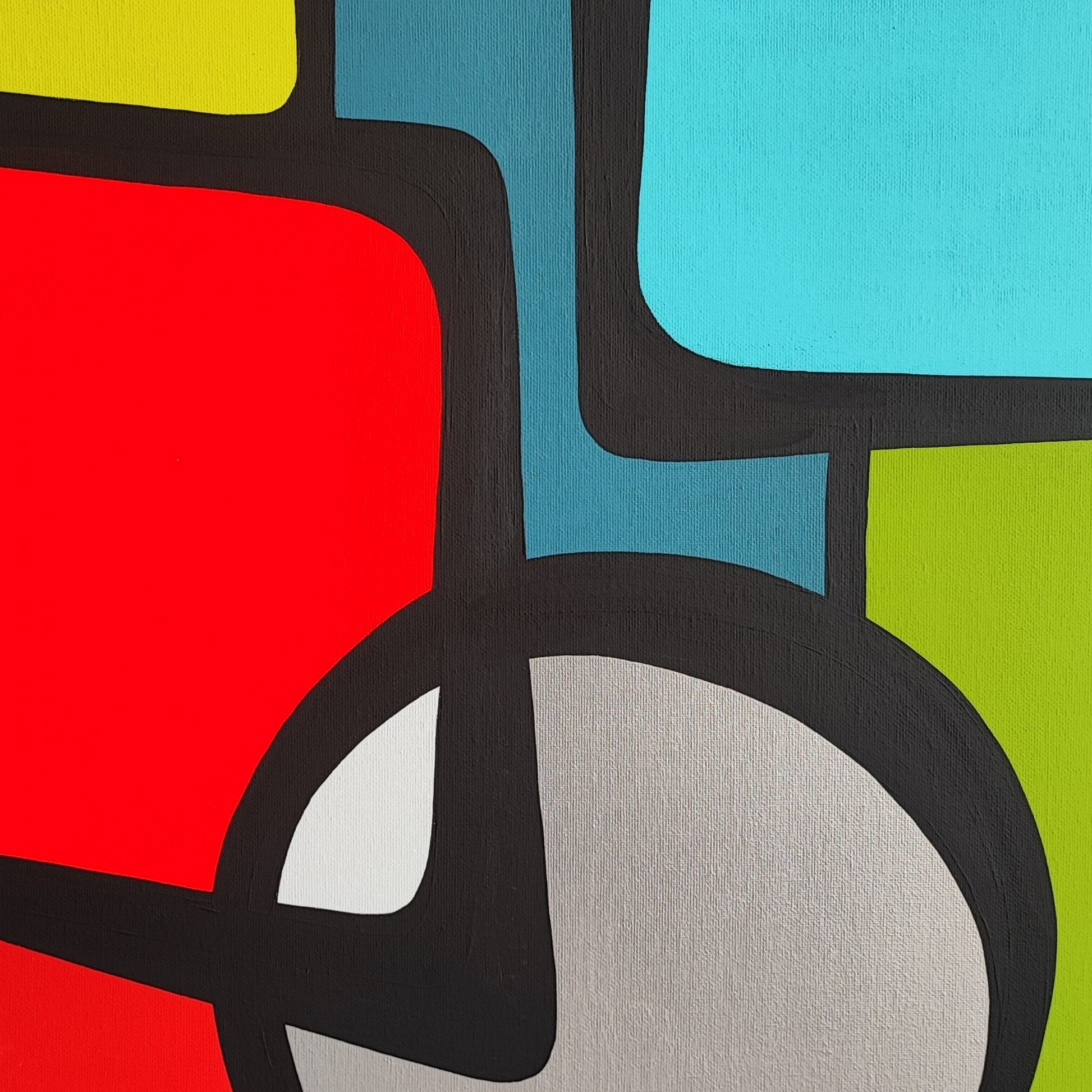 An abstract painting featuring bold blocks of color in red, yellow, turquoise, green, and gray. Thick black lines intersect the composition, creating a dynamic structure and contrast between the bright hues and neutral tones.