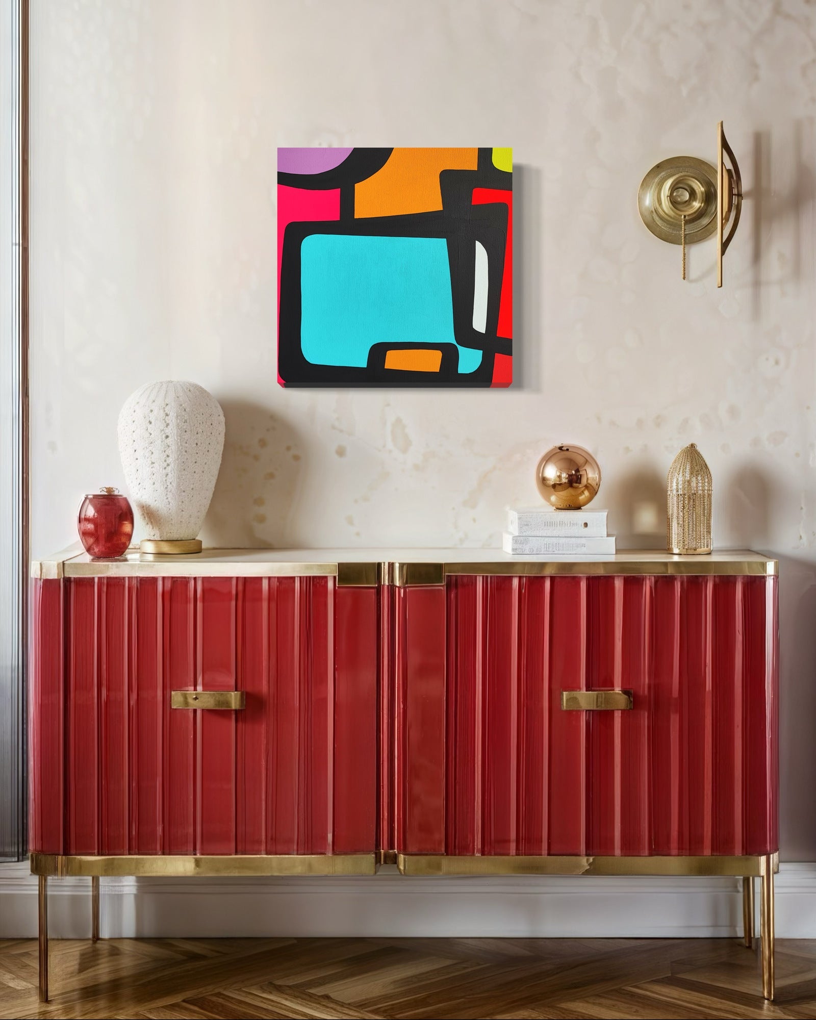 The interplay of colors and shapes creates a lively and engaging composition, evocative of mid-century modern design.